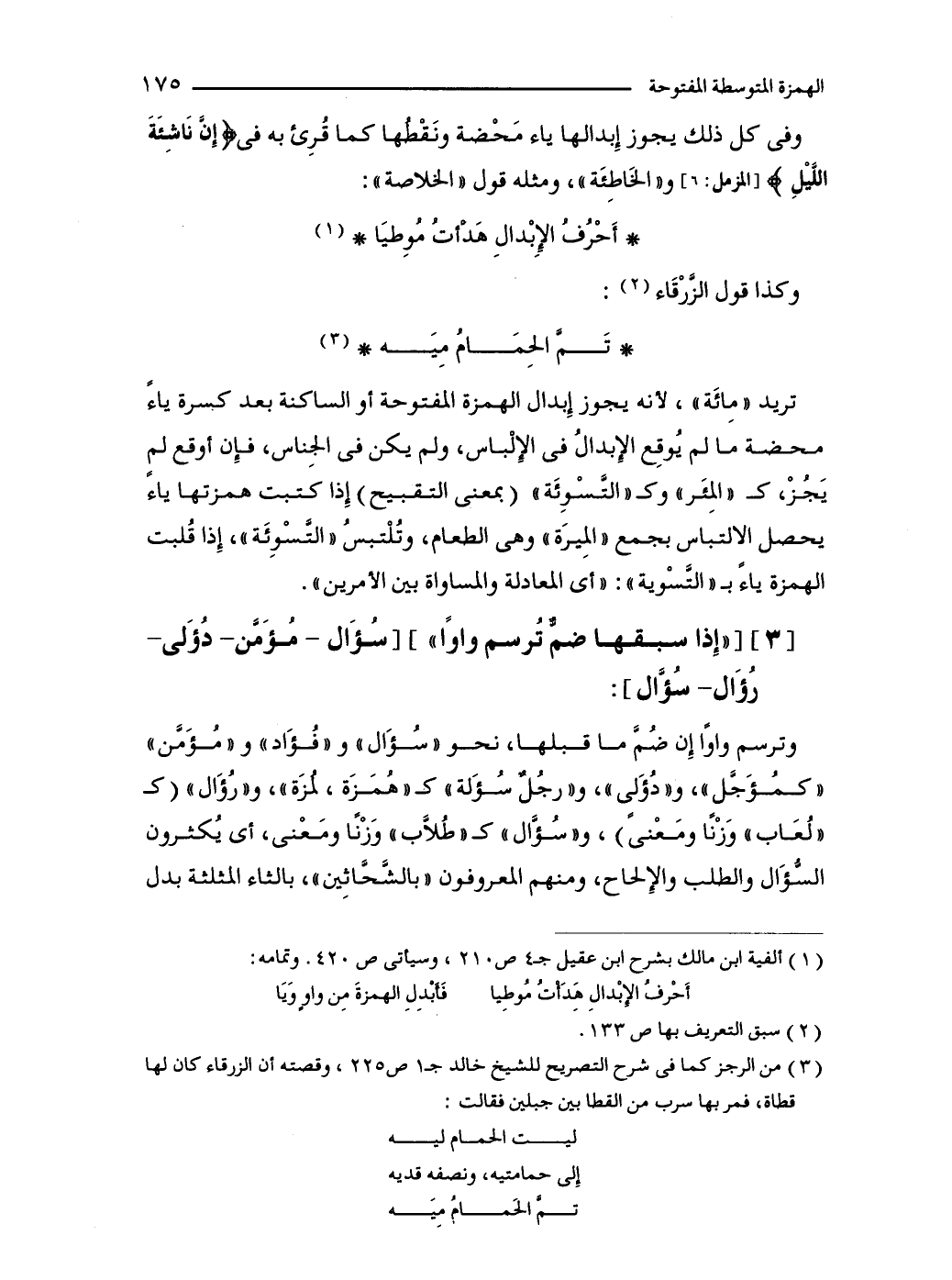 وفي كل ذلك يجوز إِبدالها ياء مَحْضة ونَقْطُها كما قُرِئ به في {إِنَّ نَاشِئَةَ اللَّيْلِ} [المزمل: 6] و"الخَاطِئَة"، ومثله قول "الخلاصة":