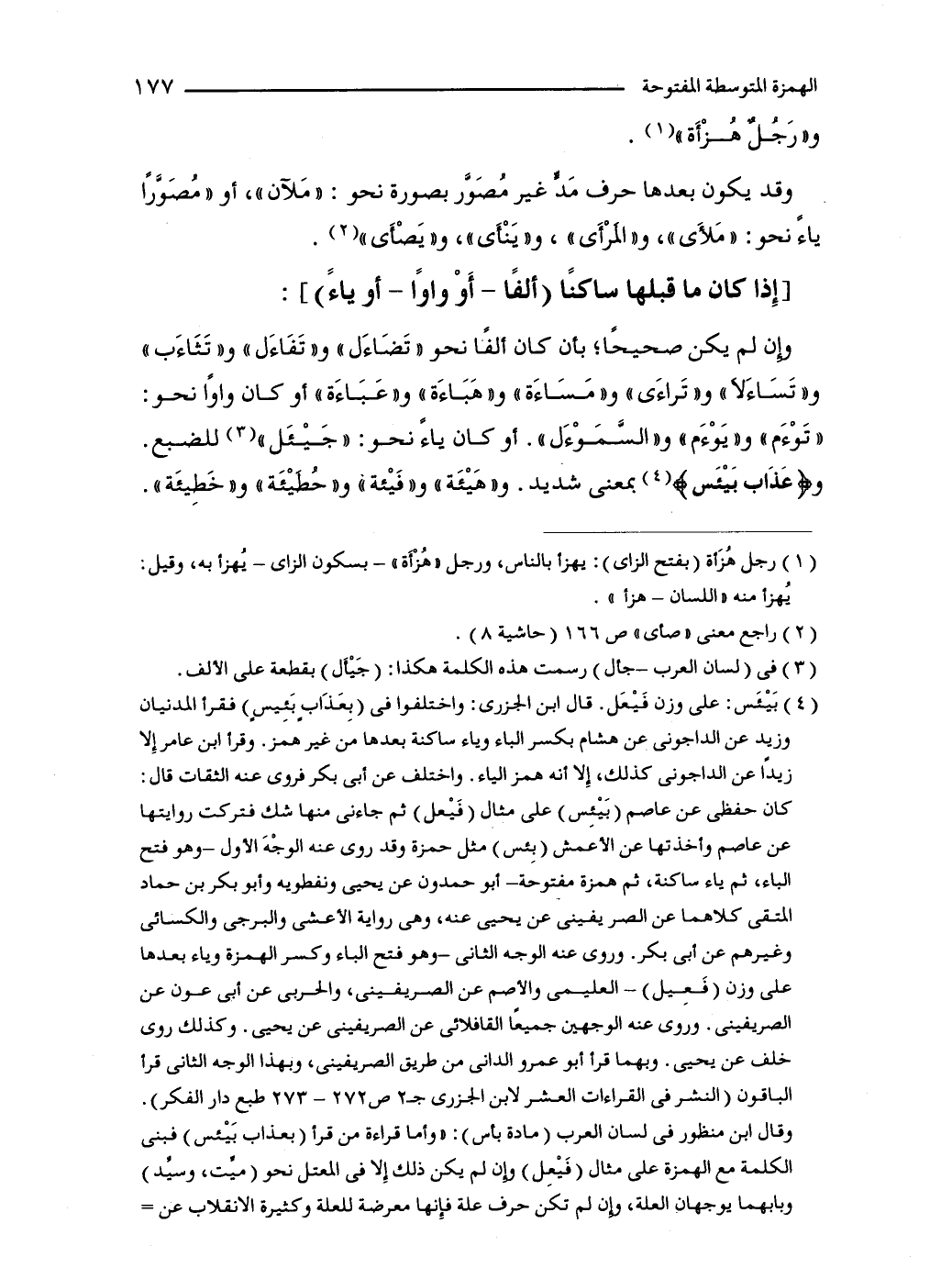 وإن لم يكن صحيحًا؛ بأن كان ألفًا نحو "تَضَاءَل" و"تَفَاءَل" و"تَثَاءَب" و"تَسَاءَلا" و"تَراءَى" و"مَسَاءَة" و"هَبَاءَة" و"عَبَاءَة" أو كان واوًا نحو: "تَوْءَم" و"يَوْءَم" و"السَّمَوْءَل". أو كان ياءً نحو: "جَيْئَل" (3) للضبع. و {عَذَاب بَيْئَس} (4) بمعنى شديد. و"هَيْئَة" و"فَيْئة" و"حُطَيْئَة" و"خَطِيئَة".