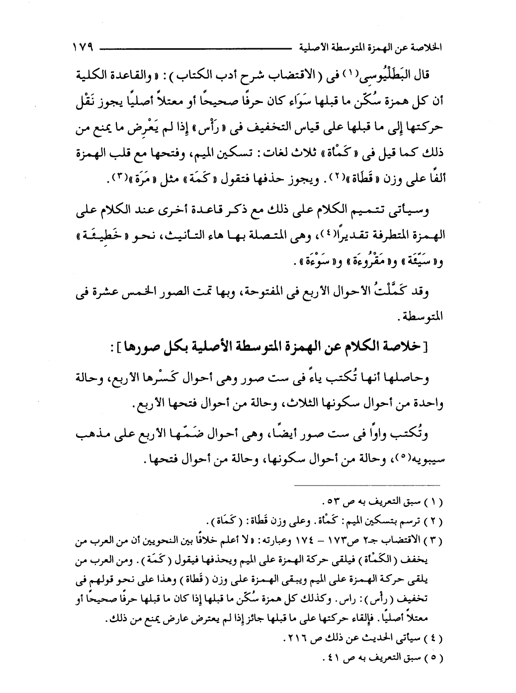 (3) الاقتضاب جـ2 ص 173 - 174 وعبارته: "لا أعلم خلافًا بين النحويين أن من العرب من يخفف (الكَمْأة) فيلقى حركة الهمزة على الميم ويحذفها فيقول (كَمَة). ومن العرب من يلقى حركة الهمزة على الميم ويبقى الهمزة على وزن (قَطاة) وهذا على نحو قولهم في تخفيف (رأس): راس. وكذلك كل همزة سُكّن ما قبلها إِذا كان ما قبلها حرفًا صحيحًا أو معتلًا أصليًا. فإِلقاء حركتها على ما قبلها جائز إِذا لم يعترض عارض يمنع من ذلك.