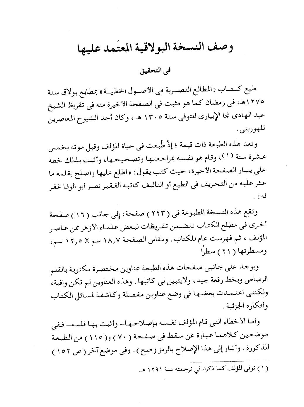 كتاب المطالع النصرية للمطابع المصرية في الأصول الخطية