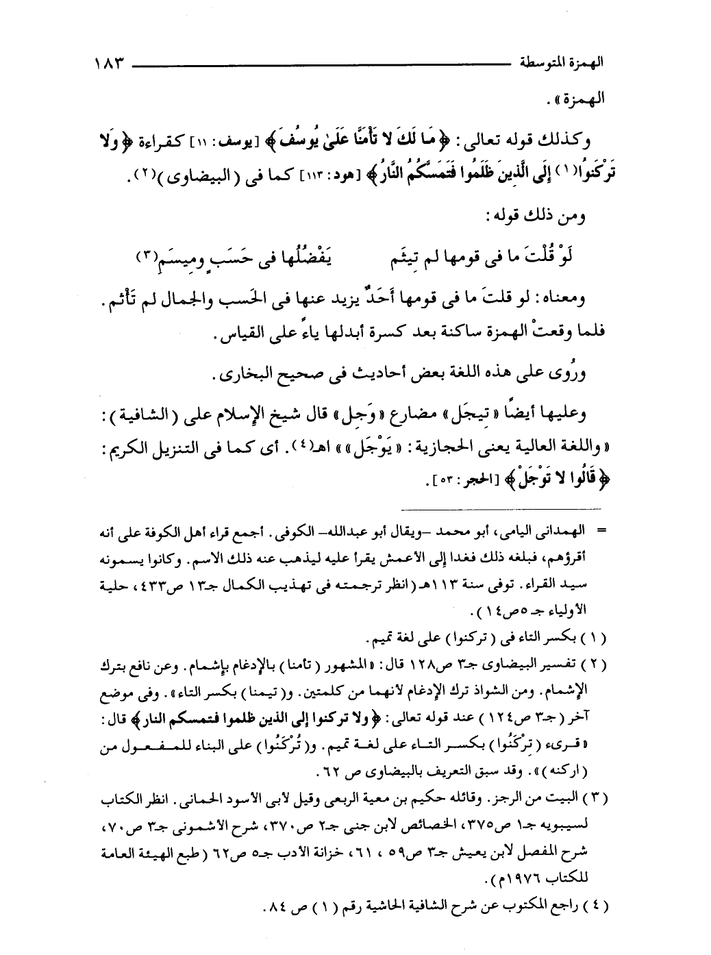 (2) تفسير البيضاوى جـ3 ص 128 قال: "المشهور (تأمنا) بالإدغام بإِشمام. وعن نافع بترك الإِشمام. ومن الشواذ ترك الإِدغام لأنهما من كلمتين. و (تيمنا) بكسر التاء". وفي موضع آخر (جـ3 ص 124) عند قوله تعالى: {وَلَا تَرْكَنُوا إِلَى الَّذِينَ ظَلَمُوا فَتَمَسَّكُمُ النَّارُ} قال: "قرئ (تِرْكَنُوا) بكسر التاء على لغة تميم. و (تُرْكَنُوا) على البناء للمفعول من (اركنه) ". وقد سبق التعريف بالبيضاوى ص 62.