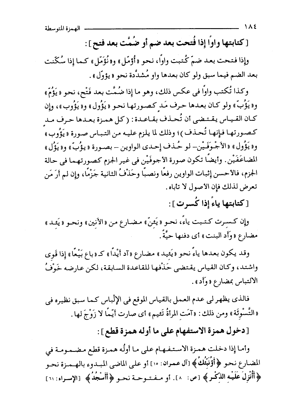 وكذا تُكتب واوًا في عكس ذلك، وهو ما إِذا ضُمَّت بعد فَتْح، نحو "يَؤُمّ" و"يَؤُبّ" ولو كان بعدها حرف مَدٍ كصورتها نحو "يَؤول" و"يَؤُوب"، وإن كان القياس يقتضى أن تُحذف بقاعدة: (كل همزة بعدها حرف مدٍ كصورتها فإِنها تُحذف)؛ وذلك لما يلزم عليه من التباس صورة "يَؤُوب" و "يَؤُول" "الأَجْوَفَيْن -لو حُذف إِحدى الواوين- بصورة "يؤُبّ" و"يَؤُل" المضاعَفَيْن. وأيضًا تكون صورة الأجوفَيْن في غير الجزم كصورتهما في حالة الجزم، فالأحسن إِثبات الواوين رفعًا ونصبًا وحَذْفُ الثانية جَزْمًا، وإن لم أَرَ مَن تعرض لذلك فإِن الأصول لا تأباه.