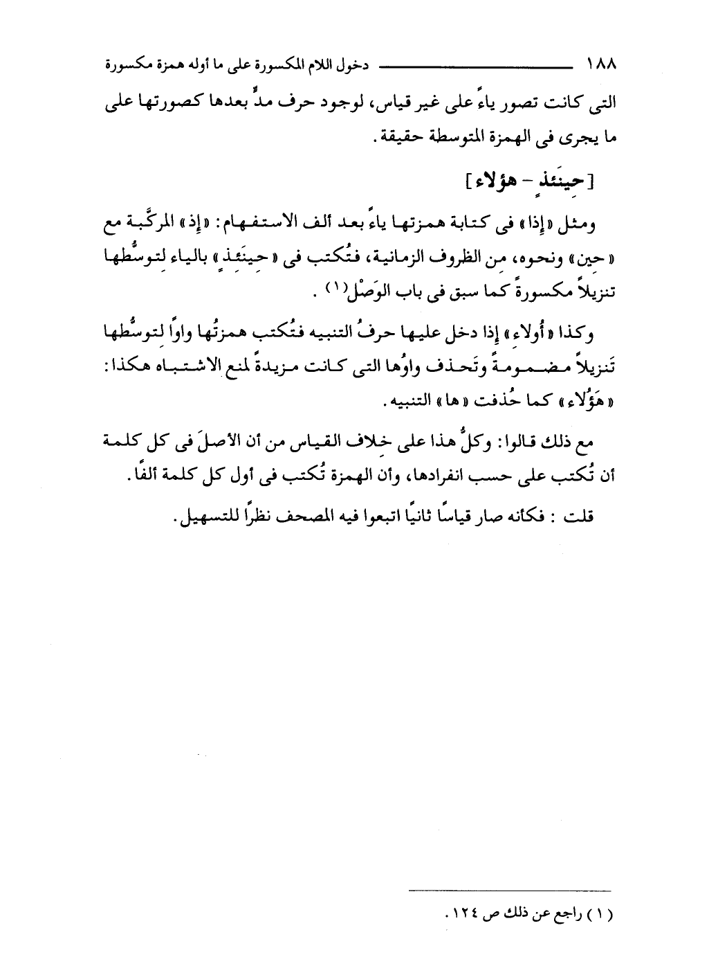 ومثل "إِذا" في كتابة همزتها ياءً بعد ألف الاستفهام: "إذ" المركَّبة مع "حِين" ونحوه، مِن الظروف الزمانية، فتُكتب في "حِينَئِذٍ" بالياء لِتوسُّطها تنزيلًا مكسورةً كما سبق في باب الوَصْل (1).
