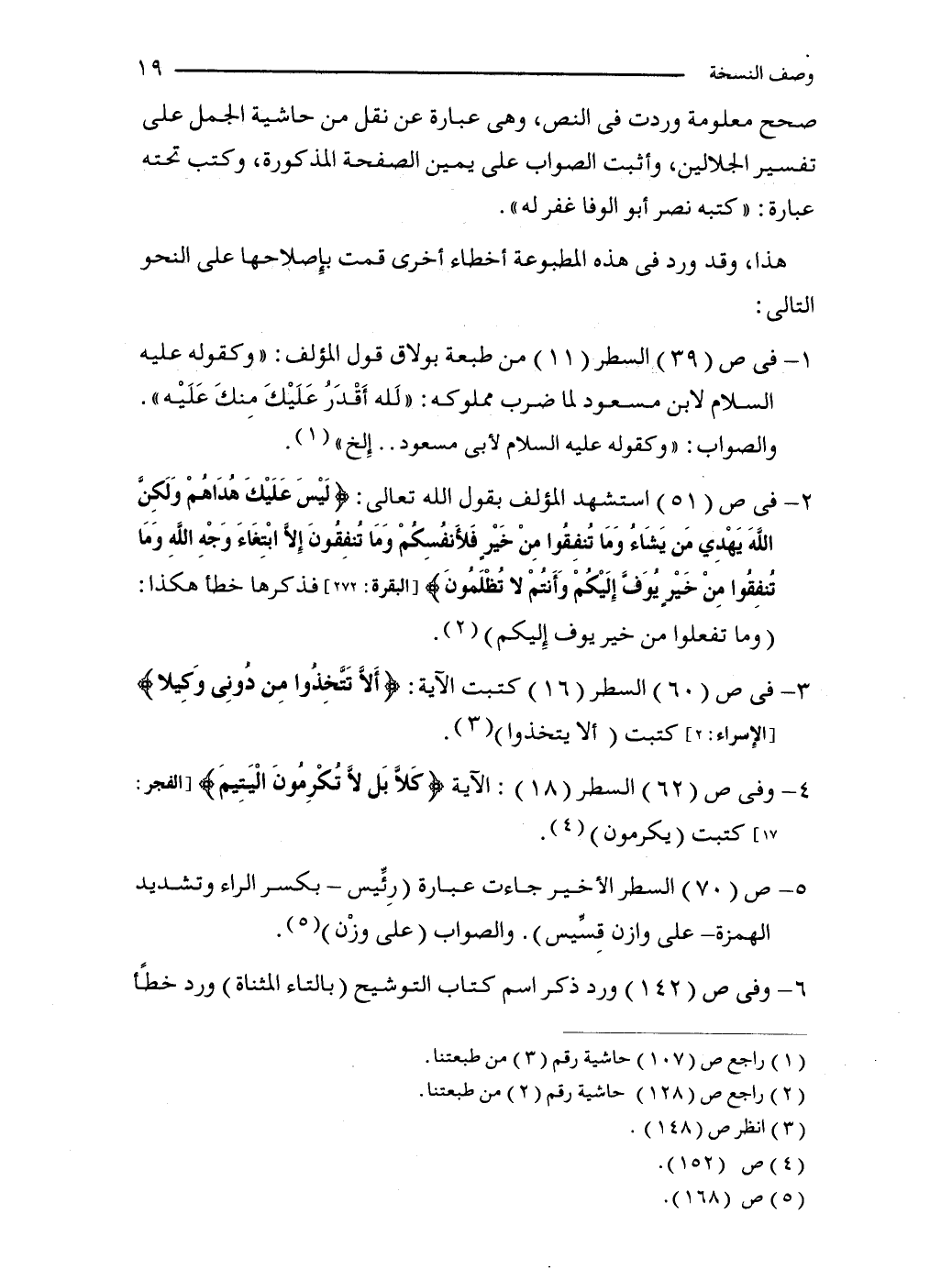 2 - في ص (51) استشهد المؤلف بقول الله تعالى: {لَيْسَ عَلَيْكَ هُدَاهُمْ وَلَكِنَّ اللَّهَ يَهْدِي مَنْ يَشَاءُ وَمَا تُنْفِقُوا مِنْ خَيْرٍ فَلِأَنْفُسِكُمْ وَمَا تُنْفِقُونَ إِلَّا ابْتِغَاءَ وَجْهِ اللَّهِ وَمَا تُنْفِقُوا مِنْ خَيْرٍ يُوَفَّ إِلَيْكُمْ وَأَنْتُمْ لَا تُظْلَمُونَ} [البقرة: 272] فذكرها خطأ هكذا: (وما تفعلوا من خير يوف إِليكم) (2).