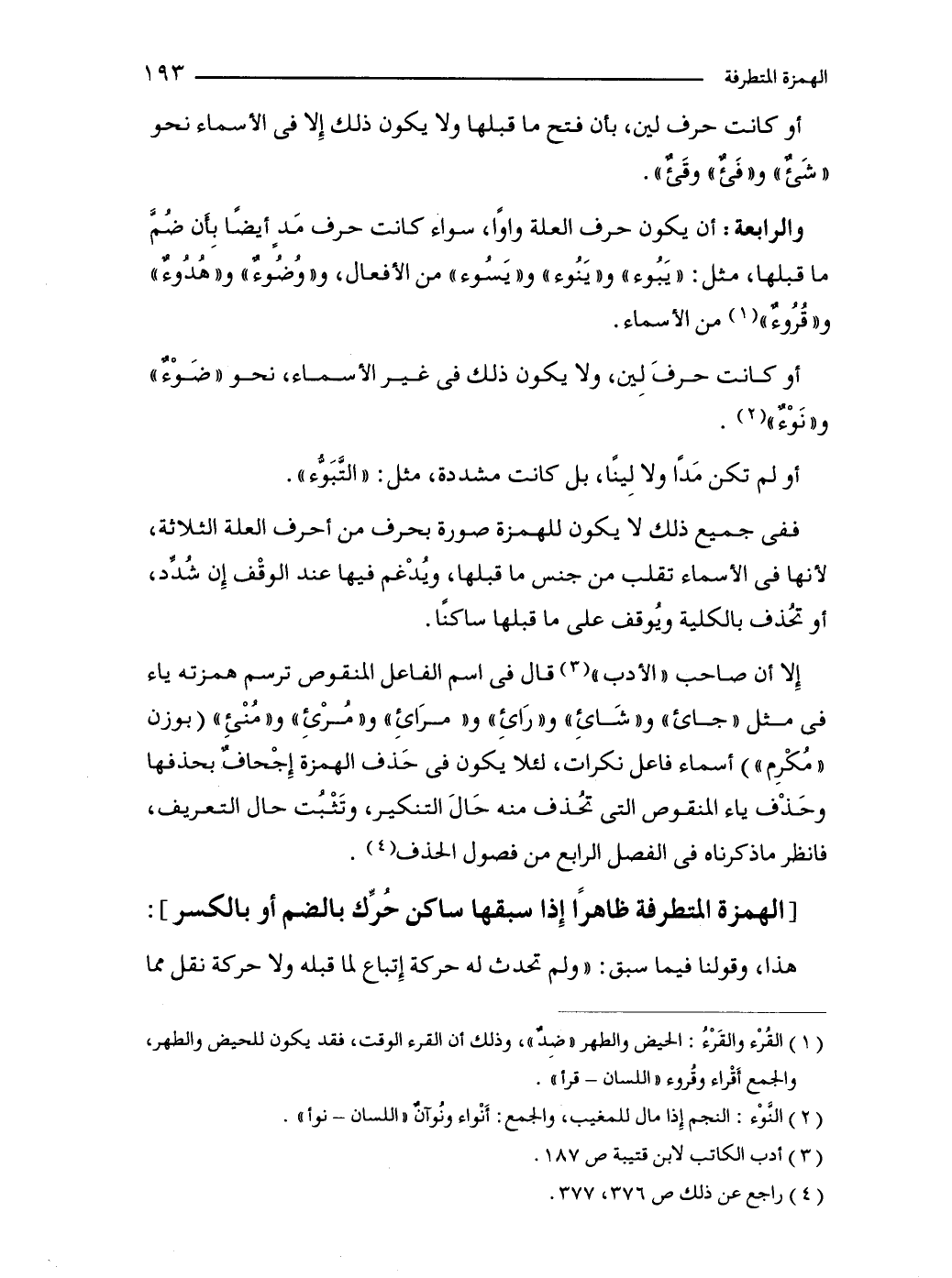 والرابعة: أن يكون حرف العلة واوًا، سواء كانت حرف مَدٍ أيضًا بِأَن ضُمَّ ما قبلها، مثل: "يَبُوء" و"يَنوء" و"يَسُوء" من الأفعال، و"وُضُوءٌ" و"هُدُوءٌ" و"قُرُوءٌ" (1) من الأسماء.