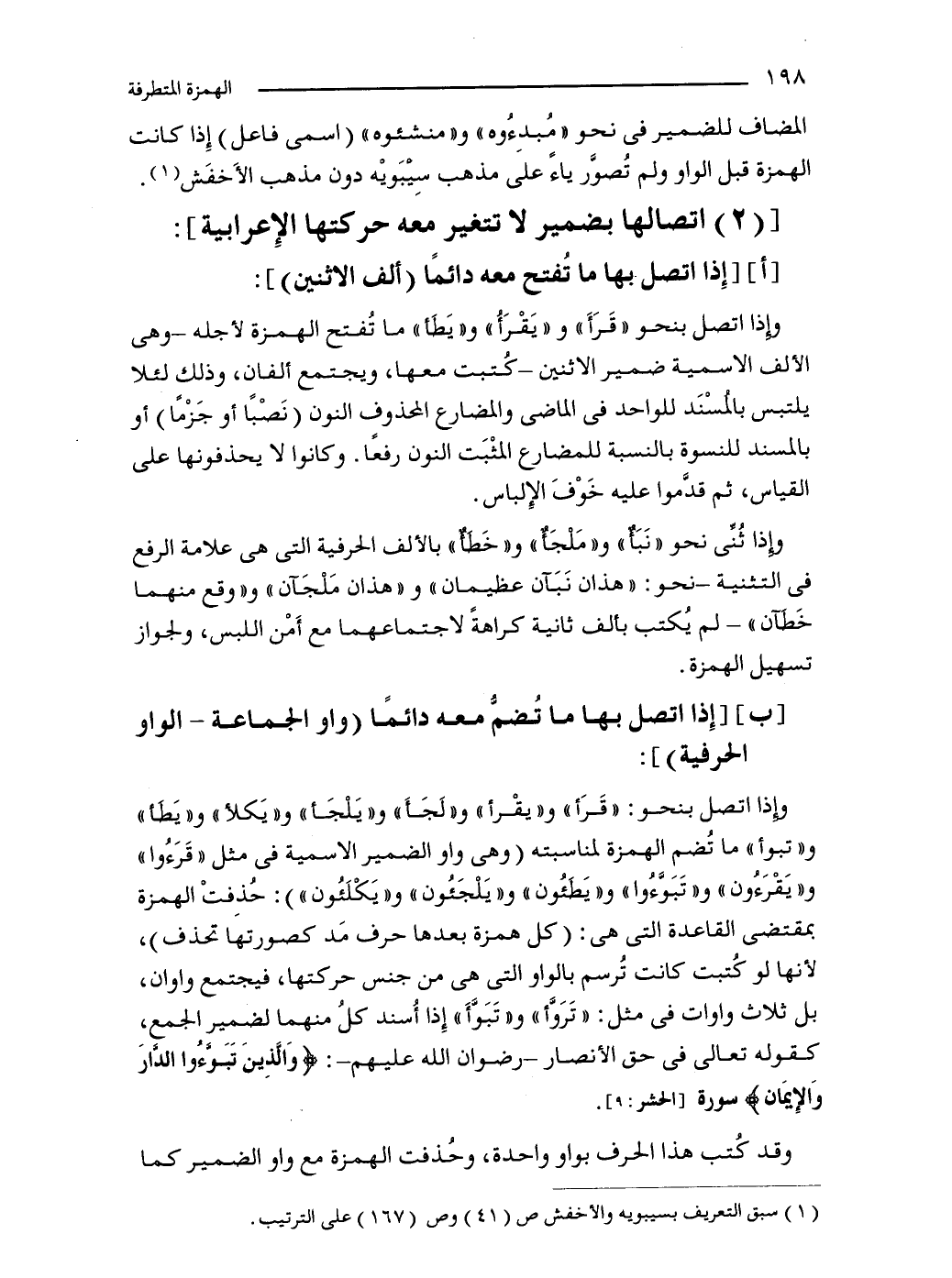 المضاف للضمير في نحو "مُبدءُوه" و"منشئوه" (اسمى فاعل) إِذا كانت الهمزة قبل الواو ولم تُصوَّر ياءً علىَ مذهب سِيْبَويْه دون مذهب الأَخفَش (1).