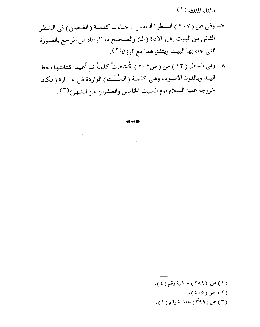 8 - وفي السطر (13) من (ص 202) كُشِطتْ كلمةٌ ثم أُعيد كتابتها بخط اليد وباللون الأسود، وهي كلمة (السَّبْت) الواردة في عبارة (فكان خروجه عليه السلام يوم السبت الخامس والعشرين من الشهر) (3).