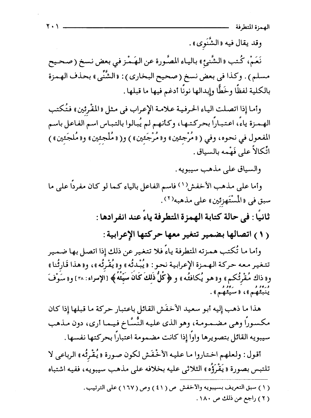 وأما ما تُكتب همزته المتطرفة ياءً فلا تتغير عن ذلك إِذا اتصل بها ضمير تتغير معه حركة الهمزة الإِعرابية نحو: "يُبْدئُه" و"يُقْرِئُه"، و"هذا قَارئُنا" و"ذاك مُقْرِئُكم" و"هو يُكافئُه" و {كُلُّ ذَلِكَ كَانَ سَيِّئُهُ} [الإِسراء: 38] و"سوْفَ يُنَبِّئُهُم"، "سَيِّئُهُم".