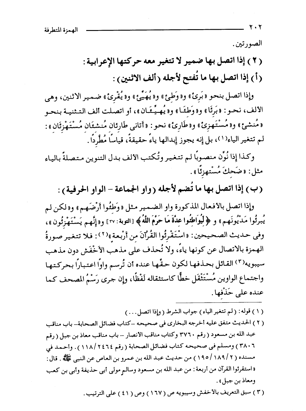 وإذا اتصل بالأفعال المذكورة واو الضمير مثل "وَطِئُوا أَرْضَهم" و"لكن لم يُبرئُوا مَدْيُونَهم" و {لِيُوَاطِئُوا عِدَّةَ مَا حَرَّمَ اللَّهُ} [التوبة: 37] و"إِنَّهم يَسْتَهْزِئُون"، وفي حديث الصحيحين: "اسْتَقْرِئُوا القُرْآنَ مِن أَرْبعةٍ" (2): فلا تتغير صورةُ الهمزة بالاتصال عن كونها ياءً، ولا تحذف على مذهب الأَخْفَش دون مذهب سيبويه (3) القائل بحذفها لكون حقِّها عنده أن تُرسم واوًا اعتبارًا بحركتها واجتماع الواوين مُسْتَثْقَل خطًا كاستثقاله لَفْظًا، وإن جرى رَسْمُ المصحف كما عنده على حَذْفِها.