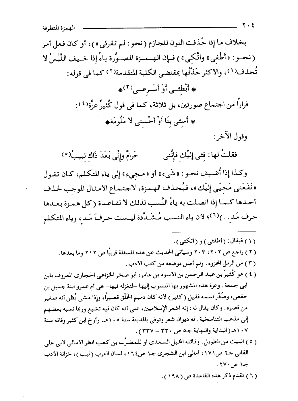 وكذا إِذا أُضيف نحو: "شَىء" أو "مجِىء" إِلى ياء المتكلم، كأن تقول "نَفَعَنى مَجِيّى إِليْك"، فيُحذف الهمزة، لاجتماع الأمثال الموجِب لحذف أحدها كما إِذا اتصلت به ياءُ النَّسب لذلك لا لقاعدة (كل همزة بعدها حرف مَدٍ ..) (6)؛ لأن ياء النسب مُشَدَّدة ليست حرفَ مَدٍ، وياء المتكلم