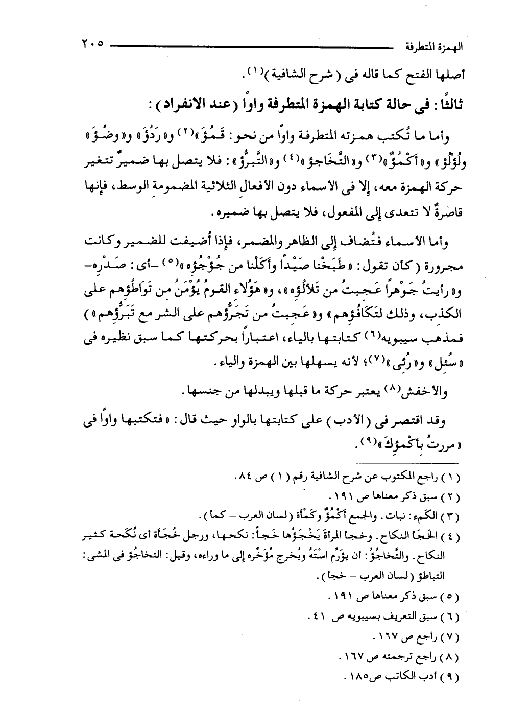 وأما ما تُكتب همزته المتطرفة واوًا من نحو: قَمُؤَ" (2) و"رَدُؤَ" و"وضُؤَ" ولُؤْلُؤ" و"أكْمُؤٌ" (3) و"التَّخَاجؤ" (4) و"التَّبرُّؤ": فلا يتصل بها ضميرٌ تتغير حركة الهمزة معه، إِلا في الأسماء دون الأفعالِ الثلاثية المضمومةِ الوسط، فإِنها قاصرةٌ لا تتعدي إلى المفعول، فلا يتصل بها ضميره.
