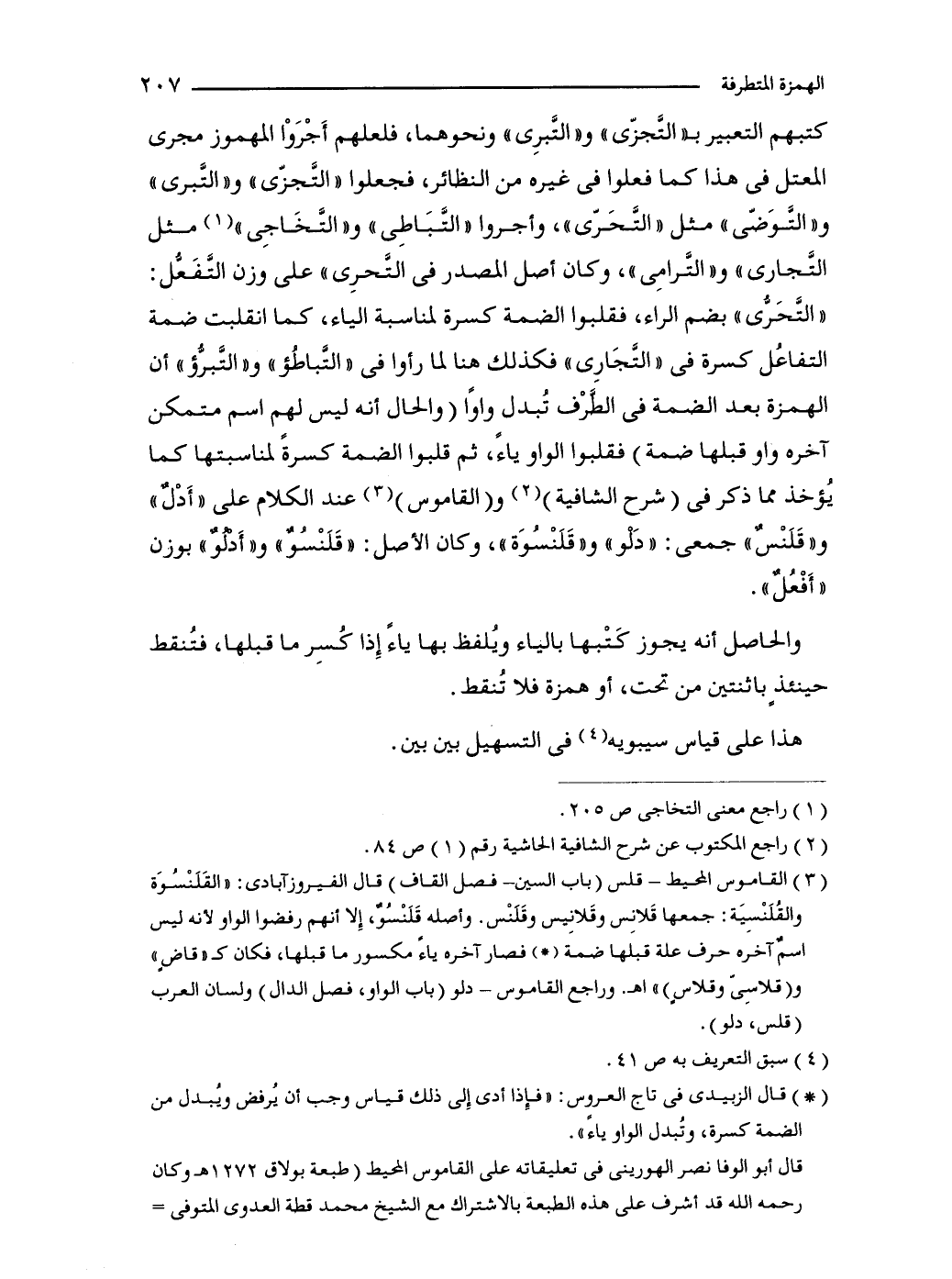 كتبهم التعبير بـ"التَّجزّى" و"التَّبرِى" ونحوهما، فلعلهم أَجْرَوْا المهموز مجرى المعتل في هذا كما فعلوا في غيره من النظائر، فجعلوا "التَّجزّى" و"التَّبرى" و"التَّوَضّى" مثل "التَّحَرّى"، وأجروا "التَّبَاطِى" و"التَّخَاجِى" (1) مثل التَّجارى" و"التَّرامِى"، وكان أصل المصدر في التَّحرِى" على وزن التَّفَعُّل: "التَّحَرى" بضم الراء، فقلبوا الضمة كسرة لمناسبة الياء، كما انقلبت ضمة التفاعُل كسرة في "التَّجَارِى" فكذلك هنا لما رأوا في "التَّباطُؤ" و"التَّبرُّؤ" أن الهمزة بعد الضمة في الطَّرْف تُبدل واوًا (والحال أنه ليس لهم اسم متمكن آخره واو قبلها ضمة) فقلبوا الواو ياءً، ثم قلبوا الضمة كسرةً لمناسبتها كما يُؤخذ مما ذكر في (شرح الشافية) (2) و (القاموس) (3) عند الكلام على "أَدْلٌ" و"قَلَنْسٌ" جمعى: "دَلْو" و"قَلَنْسُوَة"، وكان الأصل: "قَلَنْسُوٌ" و"أَدْلُوٌ" بوزن "أَفْعُلٌ".