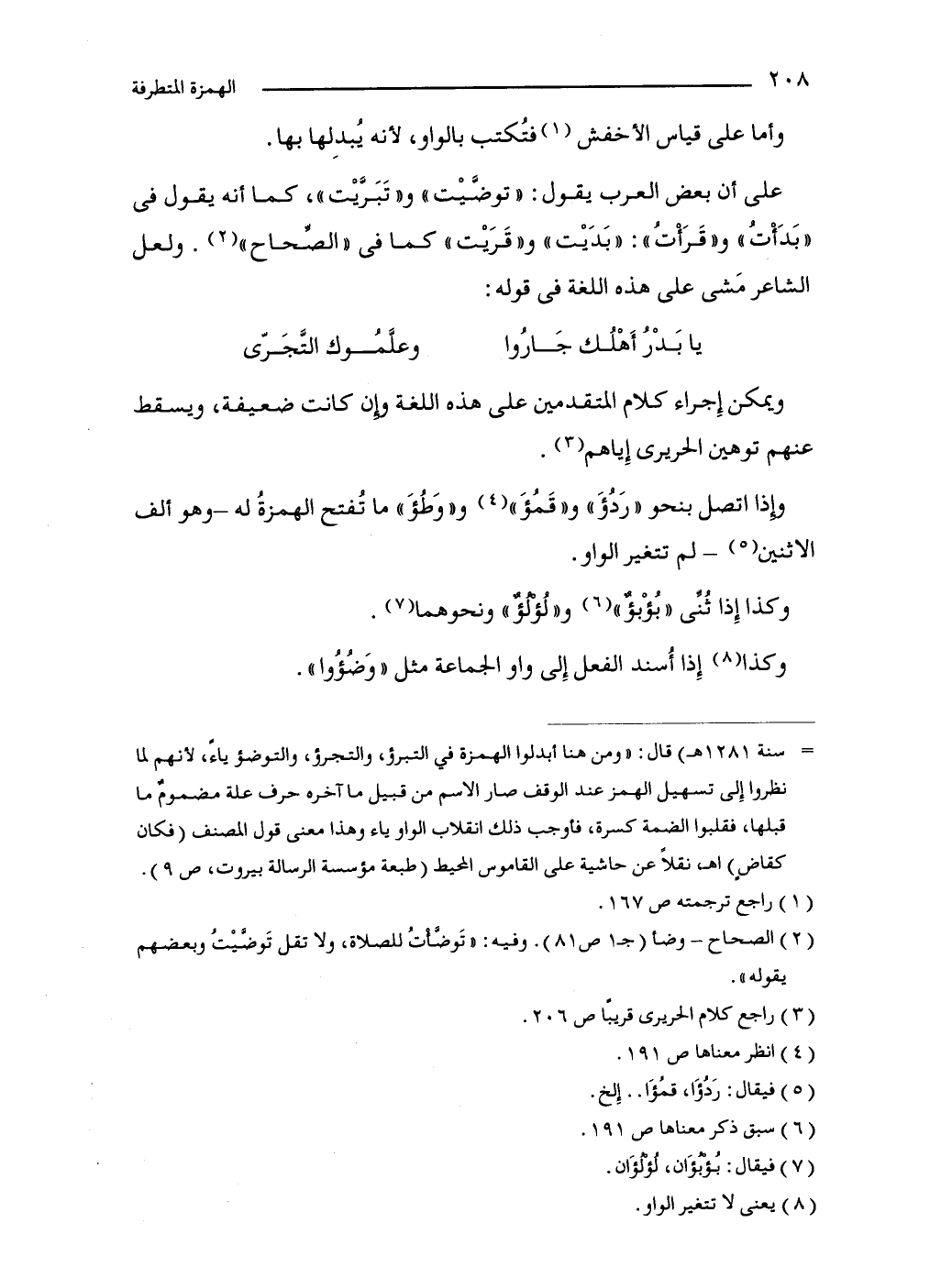 = سنة 1281 هـ) قال: "ومن هنا أبدلوا الهمزة في التبرؤ، والتجرؤ، والتوضؤ ياءً، لأنهم لما نظروا إِلى تسهيل الهمز عند الوقف صار الاسم من قبيل ما آخره حرف علة مضمومٌ ما قبلها، فقلبوا الضمة كسرة، فأوجب ذلك انقلاب الواو ياء وهذا معنى قول المصنف (فكان كقاضٍ) اهـ، نقلًا عن حاشية على القاموس المحيط (طبعة مؤسسة الرسالة بيروت، ص 9).