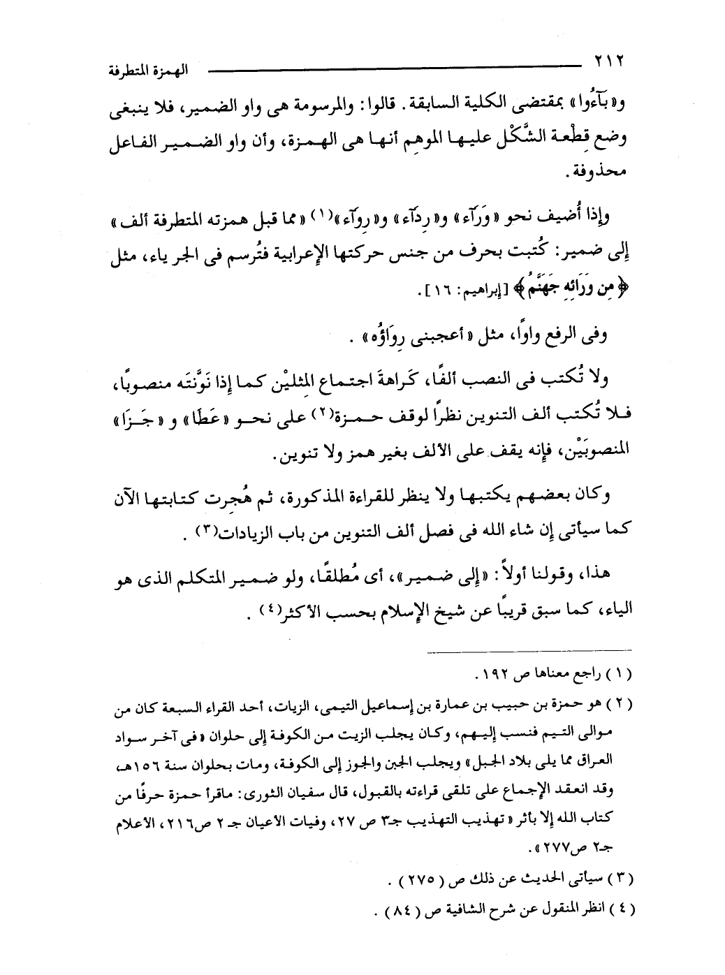 (2) هو حمزة بن حبيب بن عمارة بن إِسماعيل التيمي، الزيات، أحد القراء السبعة كان من موالى التيم فنسب إِليهم، وكان يجلب الزيت من الكوفة إِلى حلوان "في آخر سواد العراق مما يلي بلاد الجبل" ويجلب الجبن والجوز إلى الكوفة، ومات بحلوان سنة 156 هـ، وقد انعقد الإِجماع على تلقى قراءته بالقبول، قال سفيان الثورى: ما قرأ حمزة حرفًا من كتاب الله إلا بأثر "تهذيب التهذيب جـ3 ص 27، وفيات الأعيان جـ2 ص 216، الأعلام جـ2 ص 277".