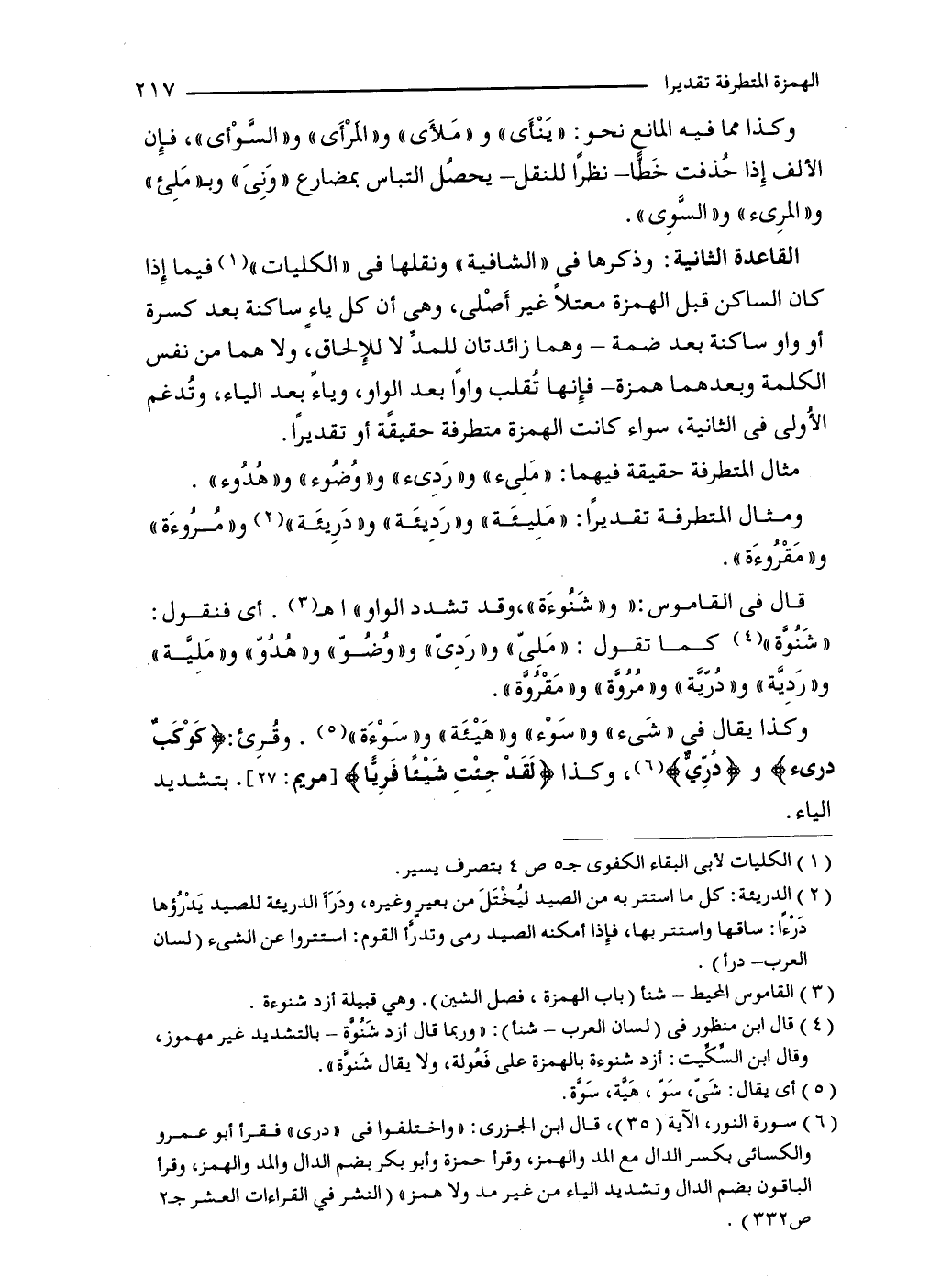 وكذا يقال في "شَىء" و"سَوْء" و"هَيْئَة" و"سَوْءَة" (5). وقُرِئ: {كَوْكَبٌ دُرِّيء} و {دُرِّيٌّ} (6)، وكذا {لَقَدْ جِئْتِ شَيْئًا فَرِيًّا} [مريم: 27]. بتشديد الياء.