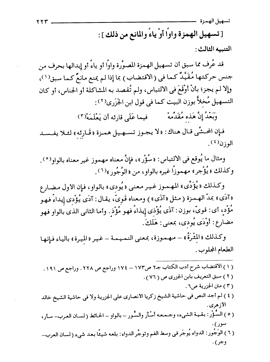 فإِن المحشِّى قال هناك: "لا يجوز تسهيل همزة "قَارِئِهِ" لئلا يفسد الوزن (4).