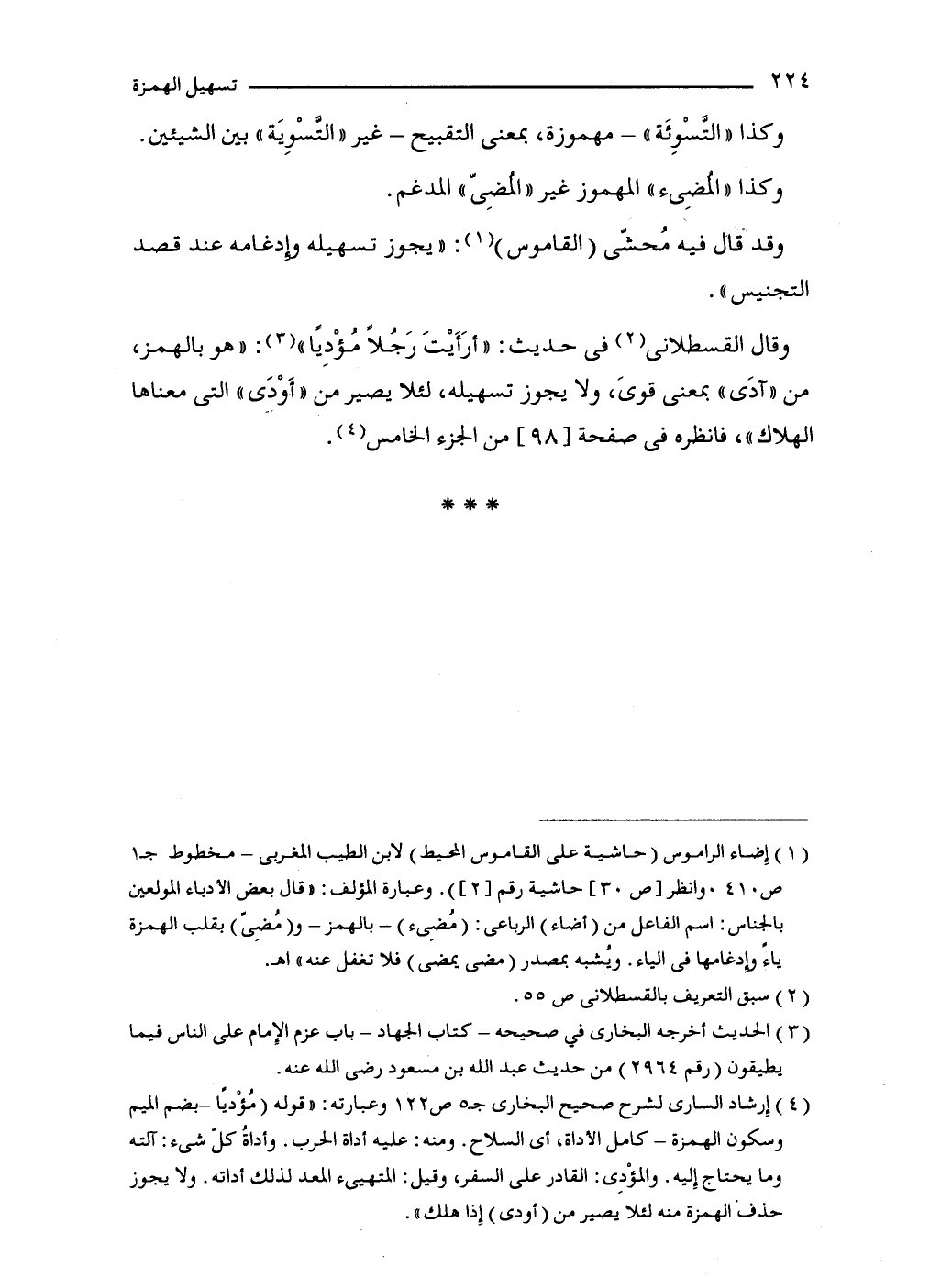 (1) إِضاء الراموس (حاشية على القاموس المحيط) لابن الطيب المغربى -مخطوط جـ1 ص 410. وانظر [ص 30] حاشية رقم [2]). وعبارة المؤلف: "قال بعض الأدباء المولعين بالجناس: اسم الفاعل من (أضاء) الرباعى: (مُضِىء) -بالهمز- و (مُضِىّ) بقلب الهمزة ياءً وإدغامها في الياء. ويُشبه بمصدر (مضى يمضي) فلا تغفل عنه" اهـ.