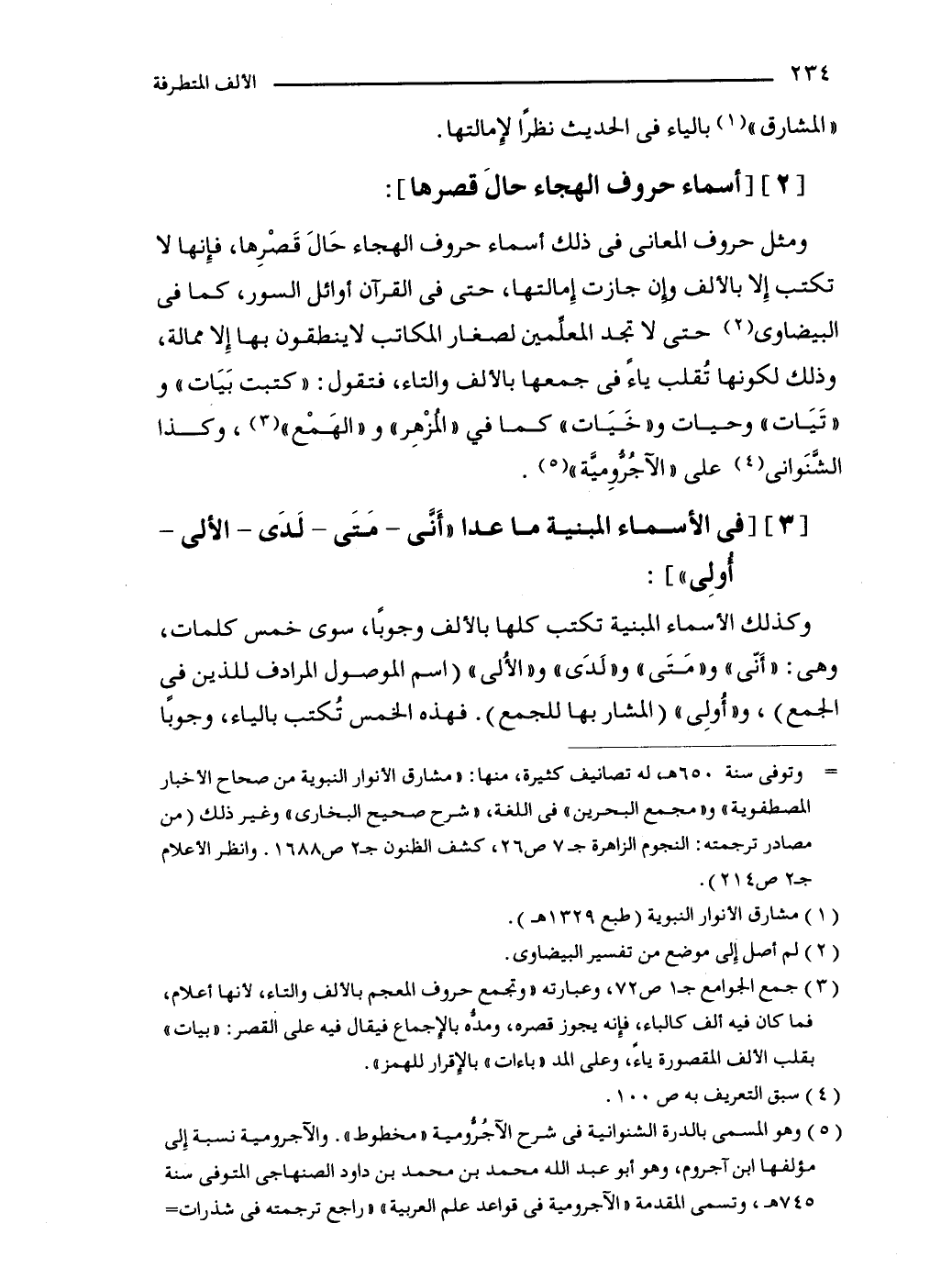 ومثل حروف المعانى في ذلك أسماء حروف الهجاء حَالَ قَصْرِها، فإِنها لا تكتب إِلا بالألف وإن جازت إِمالتها، حتى في القرآن أوائل السور، كما في البيضاوى (2) حتى لا تجد المعلِّمين لصغار المكاتب لا ينطقون بها إِلا ممالة، وذلك لكونها تُقلب ياءً في جمعها بالألف والتاء، فتقول: "كتبت بَيَات" و"تَيَات" وحيات و"خَيَات" كما في "المُزْهِر" و"الهَمْع" (3)، وكذا الشَّنَوانى (4) على "الآجُرُّومِيَّة" (5).