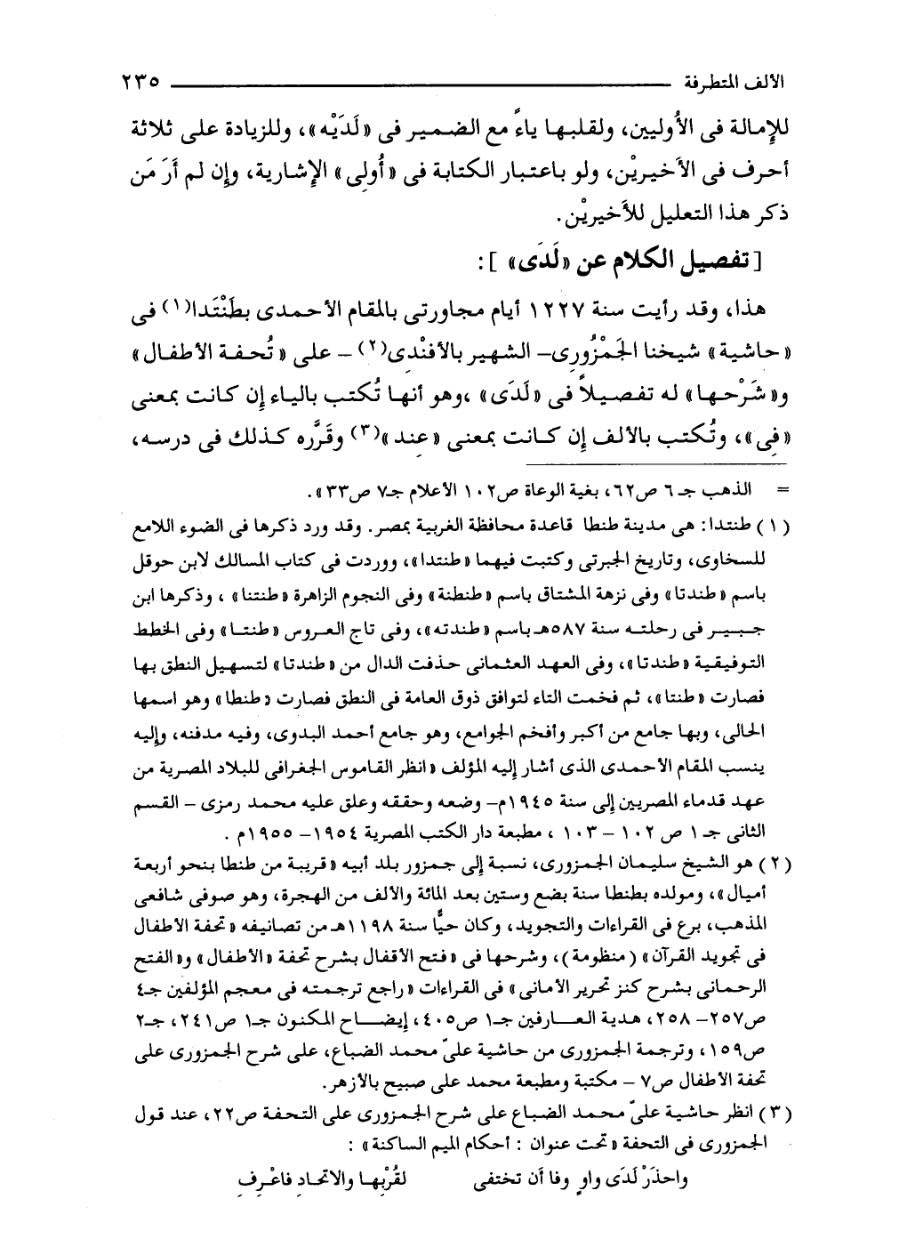 هذا، وقد رأيت سنة 1227 أيام مجاورتى بالمقام الأحمدى بطنْتَدا (1) في "حاشية" شيخنا الجَمْزُورِى -الشهير بالأفنْدِى (2) - على "تُحفة الأطفال" و"شَرْحها" له تفصيلًا في "لَدَى"، وهو أنها تُكتب بالياء إِن كانت بمعنى "في"، وتُكتب بالألف إِن كانت بمعنى "عِند" (3) وقَرَّره كذلك في درسه،