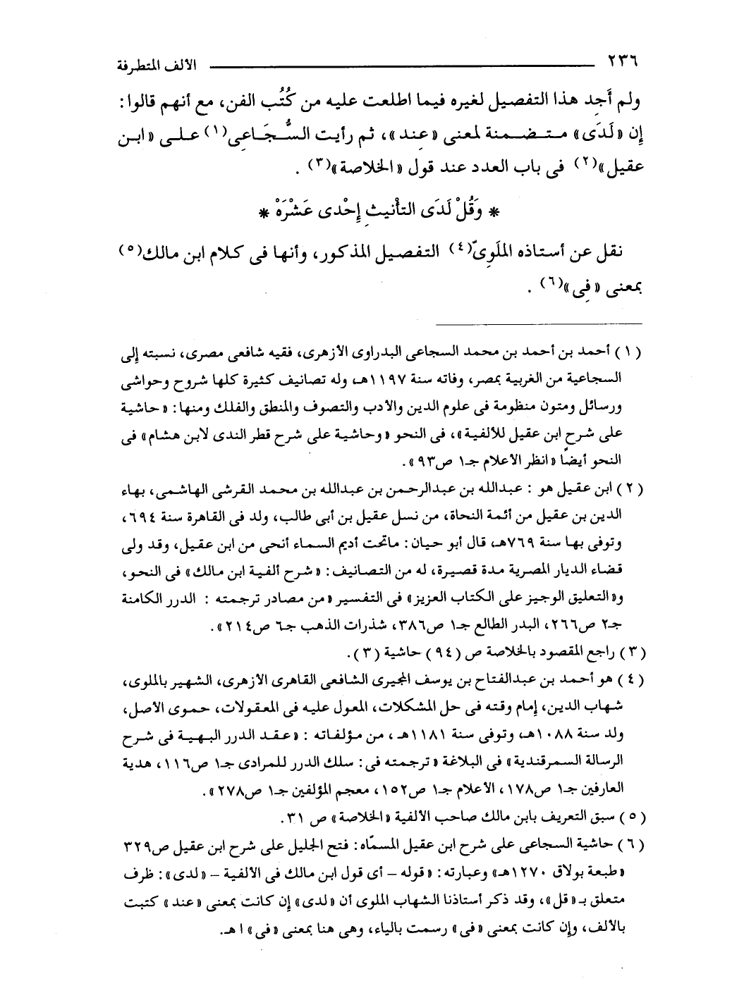 (6) حاشية السجاعى على شرح ابن عقيل المسمّاه: فتح الجليل على شرح ابن عقيل ص 329 "طبعة بولاق 1270 هـ" وعبارته: "قوله -أي قول ابن مالك في الألفية- "لدى": ظرف متعلق بـ "قل"، وقد ذكر أستاذنا الشهاب الملوى أن "لدى" إِن كانت بمعنى "عند" كتبت بالألف، وإن كانت بمعنى "في" رسمت بالياء، وهي هنا بمعنى "في" اهـ.