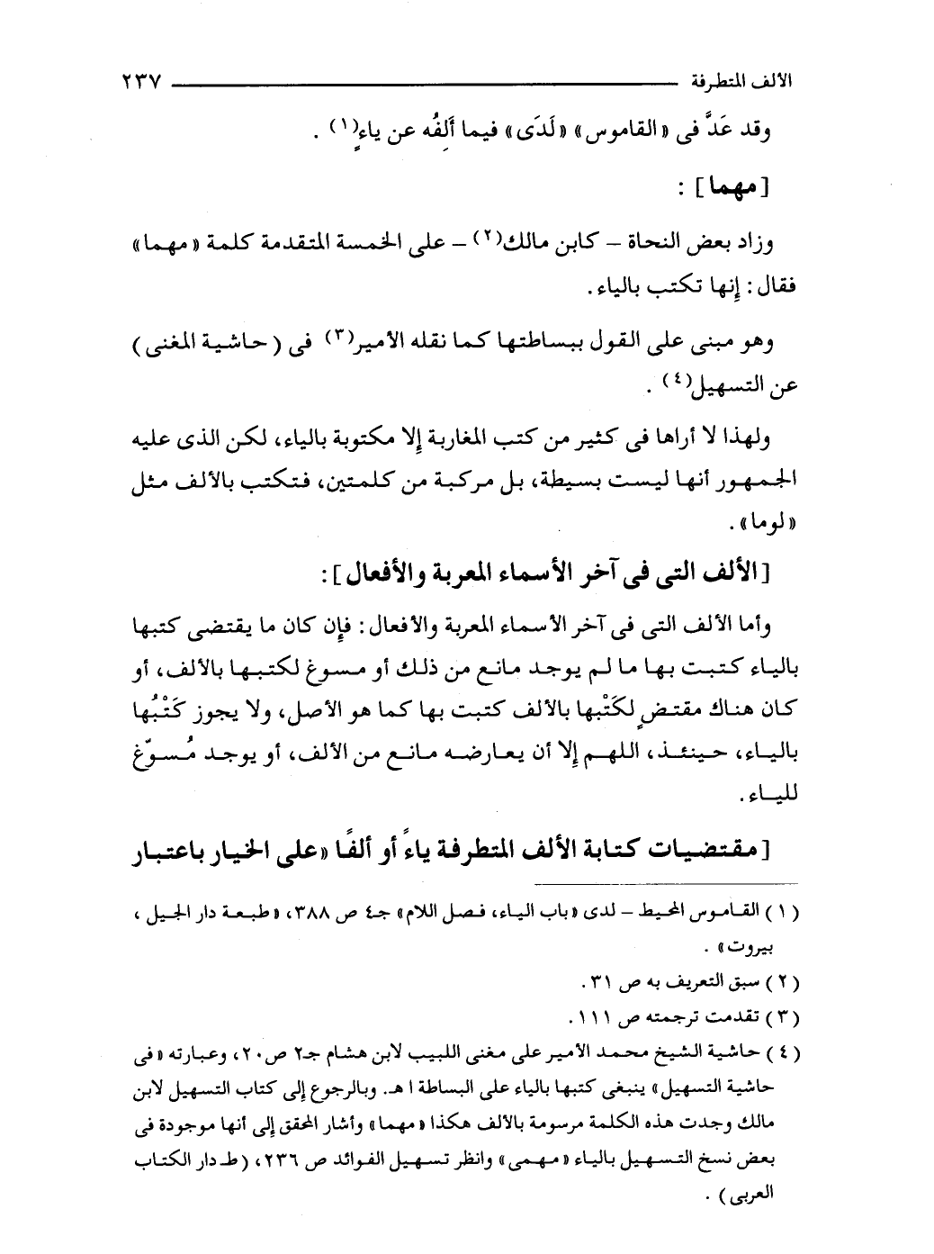 (4) حاشية الشيخ محمَّد الأمير على مغنى اللبيب لابن هشام جـ2 ص 20، وعبارته "في حاشية التسهيل" ينبغى كتبها بالياء على البساطة اهـ. وبالرجوع إِلى كتاب التسهيل لابن مالك وجدت هذه الكلمة مرسومة بالألف هكذا "مهما" وأشار المحقق إِلى أنها موجودة في بعض نسخ التسهيل بالياء "مهمى" وانظر تسهيل الفوائد ص 236، (ط دار الكتاب العربى).