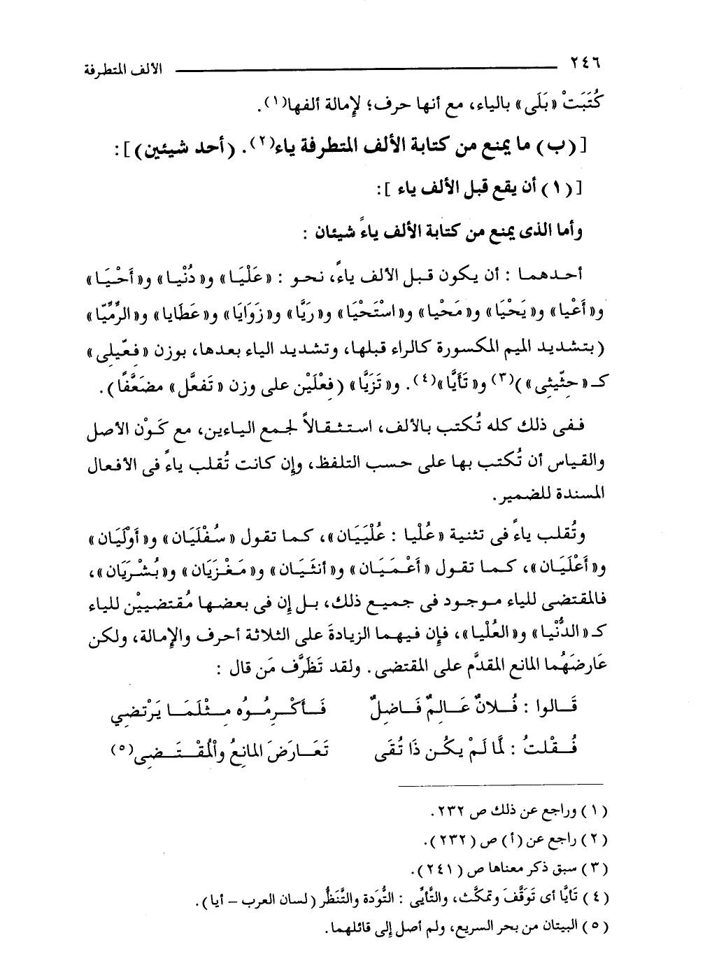 ففى ذلك كله تُكتب بالألف، استثقالًا لجمع الياءين، مع كَوْن الأصل والقياس أن تُكتب بها على حسب التلفظ، وإن كانت تُقلب ياءً في الأفعال المسندة للضمير.