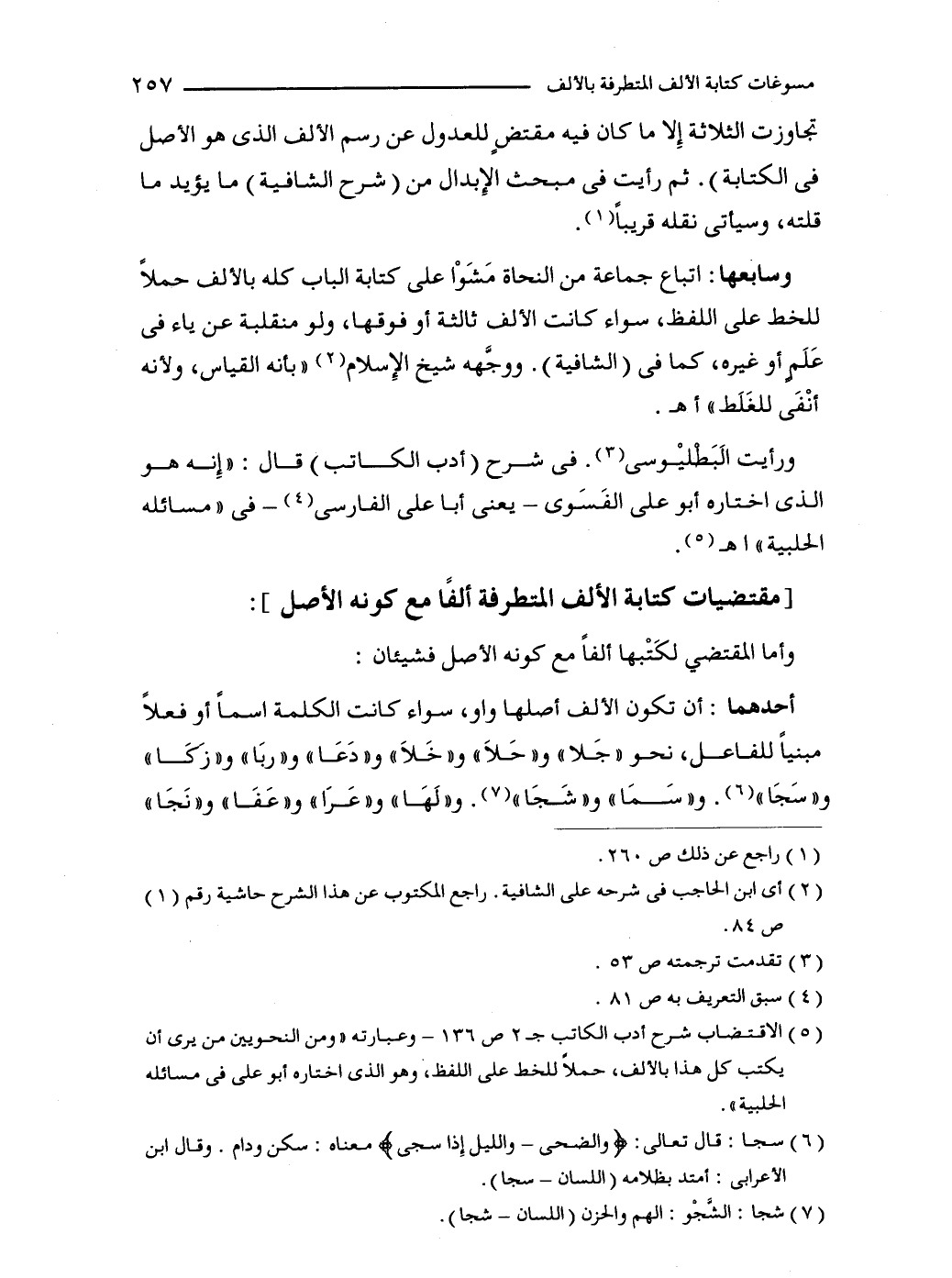 (5) الاقتضاب شرح أدب الكاتب جـ2 ص 136 - وعبارته "ومن النحويين من يرى أن يكتب كل هذا بالألف، حملًا للخط على اللفظ، وهو الذي اختاره أبو على في مسائله الحلبية".
