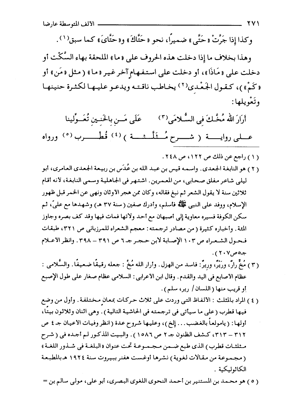 وهذا بخلاف ما إِذا دخلت هذه الحروف على "ما" الملحقة بهاء السَّكْت أو دخلت على "مَاذَا"، أو دخلت على استفهامٍ آخر غير "ما" (مثل "مَن" أو "كَمْ")، كقول الجَعْدِى (2) يخاطب ناقته ويدعو عليها لكثرة حنينها وتَعْويلها: