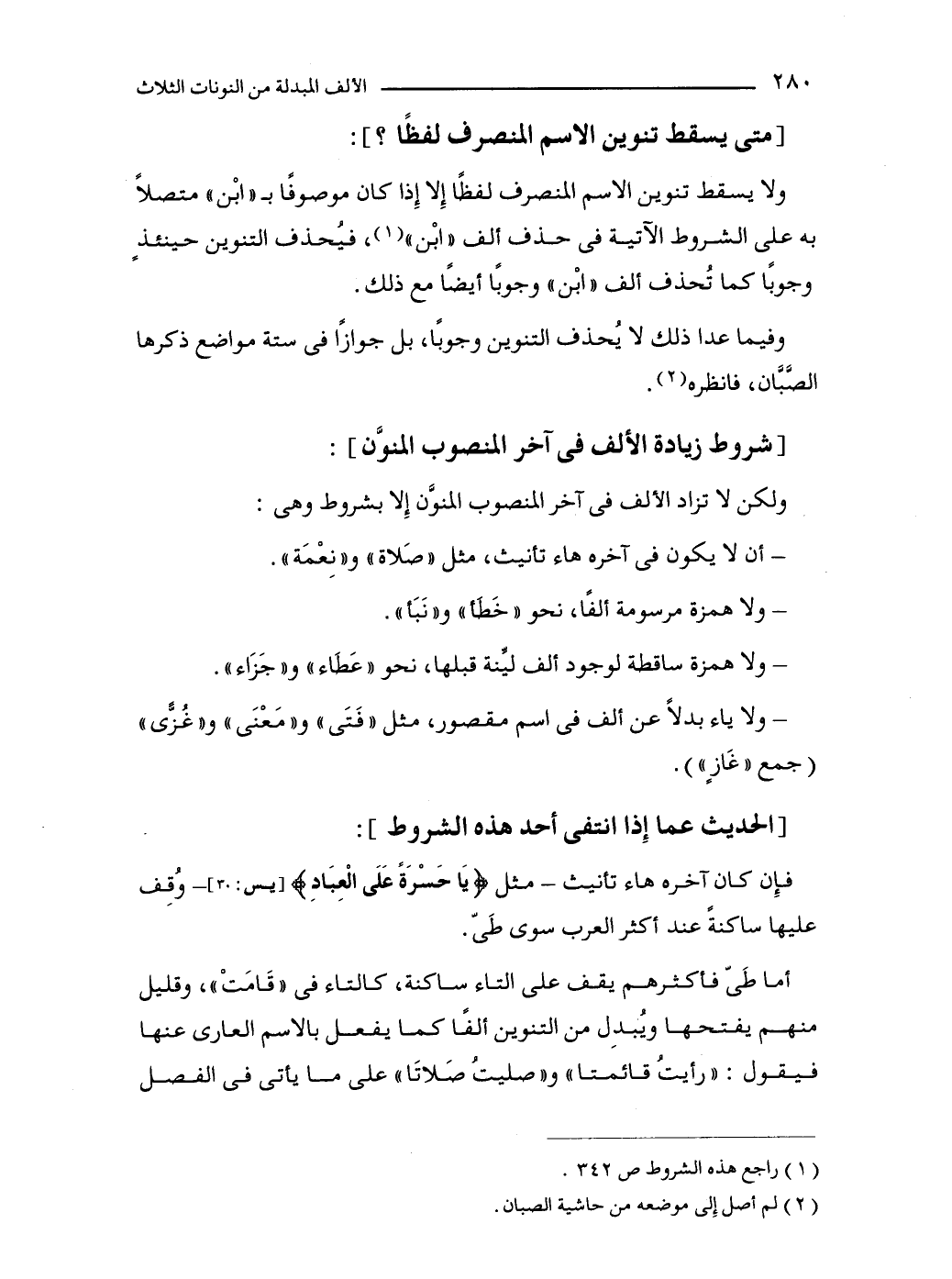 ولا يسقط تنوين الاسم المنصرف لفظًا إِلا إِذا كان موصوفًا بـ "ابْن" متصلًا به على الشروط الآتية في حذف ألف "ابْن" (1)، فيُحذف التنوين حينئذٍ وجوبًا كما تُحذف ألف "ابْن" وجوبًا أيضًا مع ذلك.