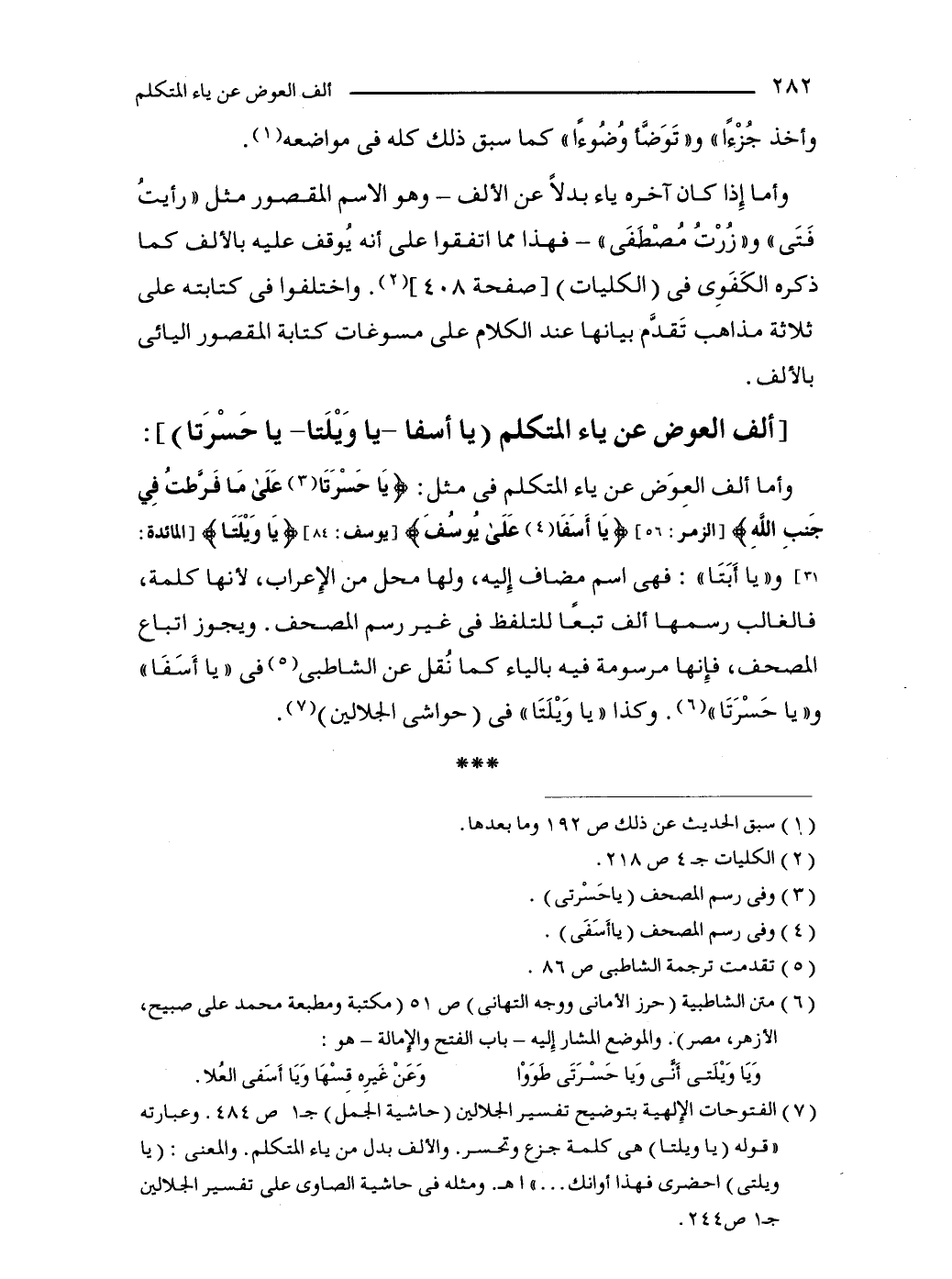 وأما ألف العِوَض عن ياء المتكلم في مثل: {يَا حَسْرَتَا (3) عَلَى مَا فَرَّطْتُ فِي جَنْبِ اللَّهِ} [الزمر: 56] {يَا أَسَفَى (4) عَلَى يُوسُفَ} [يوسف: 84] {يَا وَيْلَتَا} [المائدة: 31] و"يا أَبَتَا": فهي اسم مضاف إِليه، ولها محل من الإِعراب، لأنها كلمة، فالغالب رسمها ألف تبعًا للتلفظ في غير رسم المصحف. ويجوز اتباع المصحف، فإِنها مرسومة فيه بالياء كما نُقل عن الشاطبى (5) في "يا أَسَفَا" و"يا حَسْرَتَا" (6). وكذا "يا وَيْلَتَا" في (حواشى الجلالين) (7).