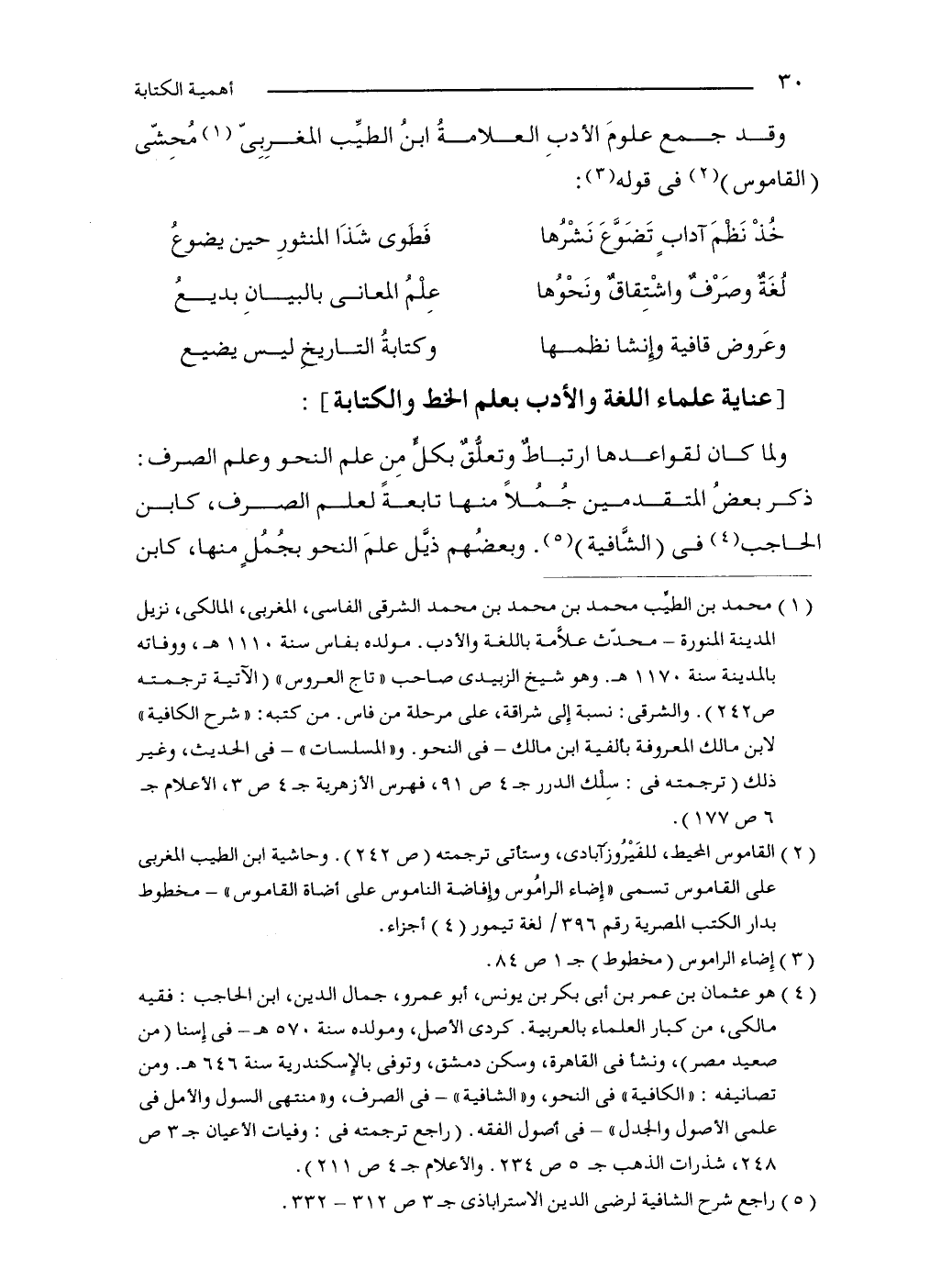 (2) القاموس المحيط، للفَيْرُوزآبادى، وستأتى ترجمته (ص 242). وحاشية ابن الطيب المغربى على القاموس تسمى "إِضاء الرامُوس وإفاضة الناموس على أضاة القاموس"- مخطوط بدار الكتب المصرية رقم 396 / لغة تيمور (4) أجزاء.