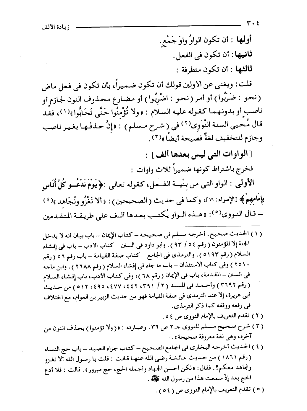قلت: ويغنى عن الأولين قولك أن تكون ضميرًا، بأن تكون في فعل ماض (نحو: ضَرَبُوا) أو أمر (نحو: اضْرِبُوا) أو مضارع محذوف النون لجازمٍ أو ناصبٍ أو بدونهما كقوله عليه السلام: "ولا تُؤْمِنُوا حَتَّى تَحَابُّوا" (1)، فقد قال مُحيى السنة النَّوَوِى (2) في (شرح مسلم): "إنَّ حذفَها بغير ناصب وجازم للتخفيف لغةٌ فصيحة أيضًا" (3).