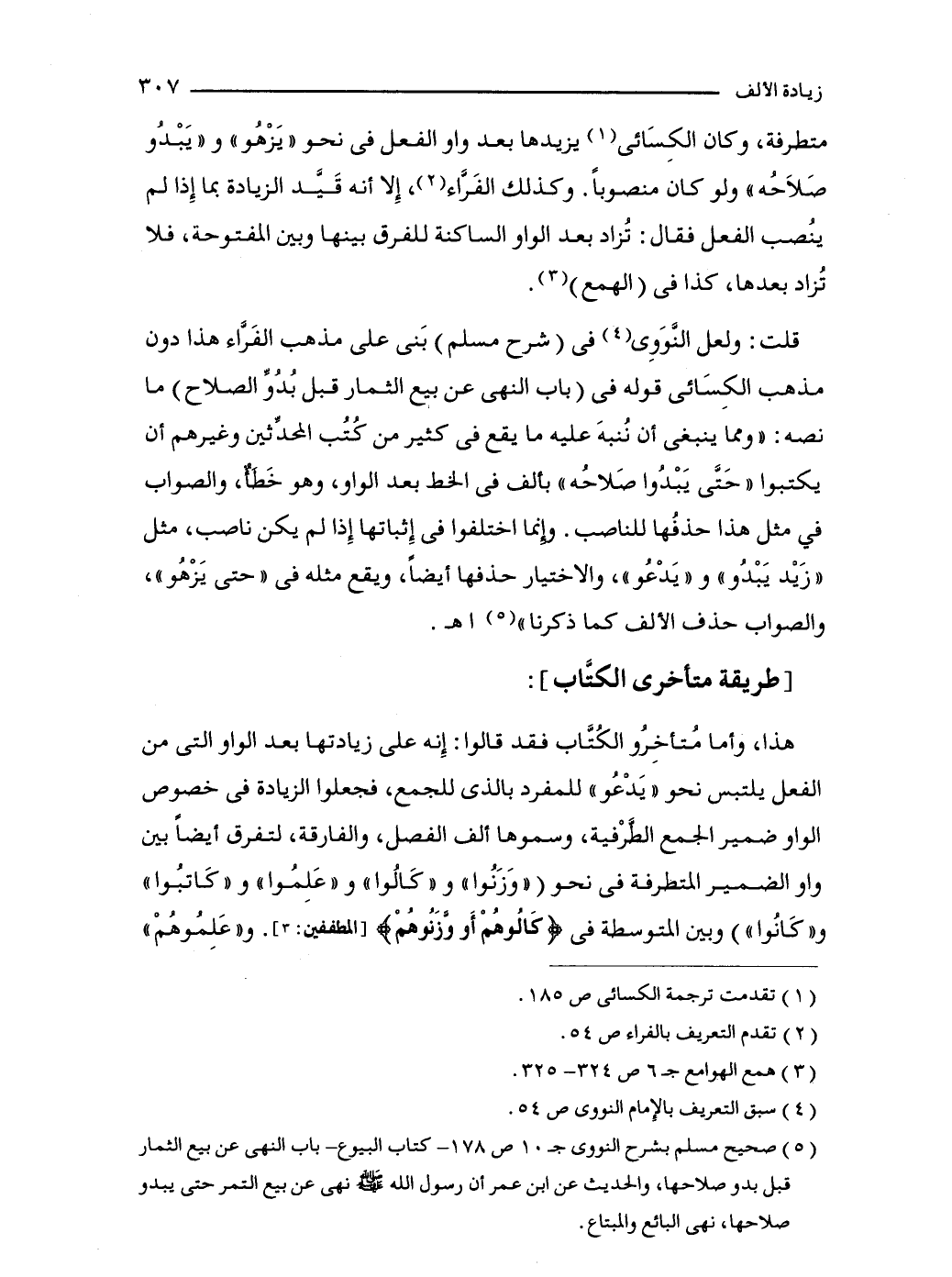 قلت: ولعل النَّوَوِى (4) في (شرح مسلم) بَنى على مذهب الفَرَّاء هذا دون مذهب الكِسَائى قوله في (باب النهى عن بيع الثمار قبل بُدُوِّ الصلاح) ما نصه: "ومما ينبغى أن نُنبهَ عليه ما يقع في كثير من كُتُب المحدِّثين وغيرهم أن يكتبوا "حَتَّى يَبْدُوا صَلاحُه" بألف في الخط بعد الواو، وهو خَطَأٌ، والصواب في مثل هذا حذفُها للناصب. وإنما اختلفوا في إِثباتها إِذا لم يكن ناصب، مثل "زَيْد يَبْدُو" و"يَدْعُو"، والاختيار حذفها أيضًا، ويقع مثله في "حتى يَزْهُو"، والصواب حذف الألف كما ذكرنا" (5) اهـ.