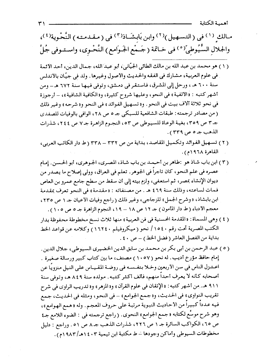 مالكٍ (1) في (التسهيل) (2) وابن بَابِشَاذ (3) في (مقدمته) النَّحْوية (4)، والجلالِ السُّيُوطِىّ (5) في خاتمة (جَمْع الجَوَامع) النَّحْوِى، واستوفى جُلَّ