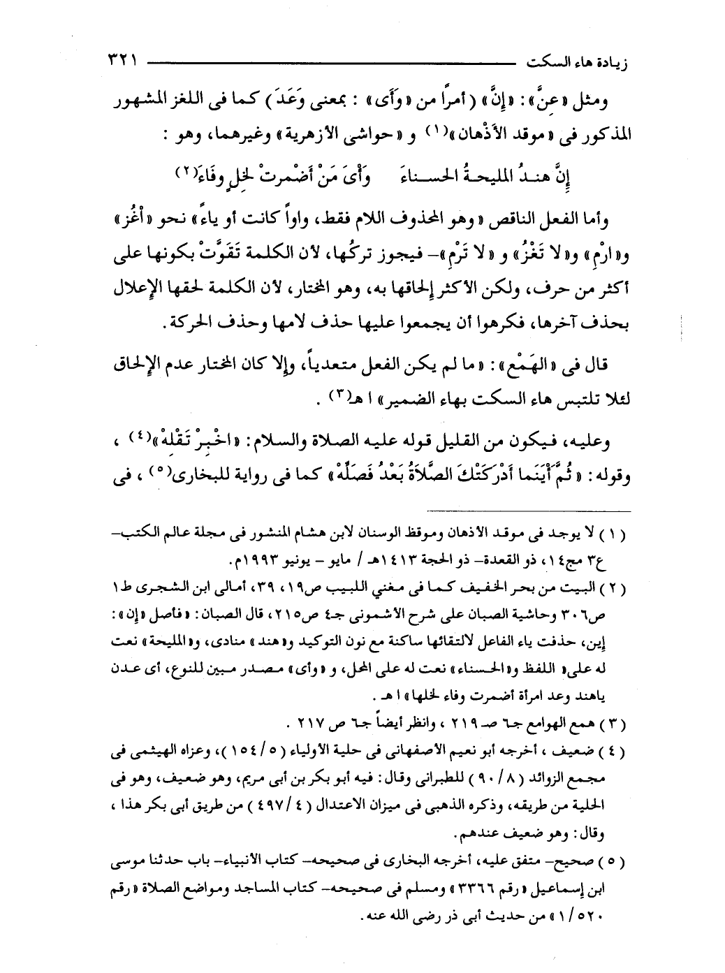 قال في "الهَمْع": "ما لم يكن الفعل متعديًا، وإلا كان المختار عدم الإِلحاق لئلا تلتبس هاء السكت بهاء الضمير" اهـ (3).