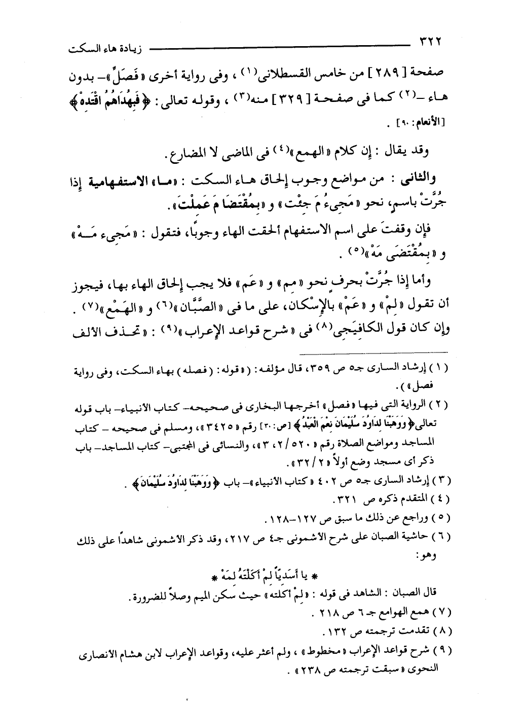صفحة [289] من خامس القسطلانى (1)، وفي رواية أخرى "فَصَلِّ" -بدون هاء- (2) كما في صفحة [329] منه (3)، وقوله تعالى: {فَبِهُدَاهُمُ اقْتَدِهْ} [الأنعام: 90].