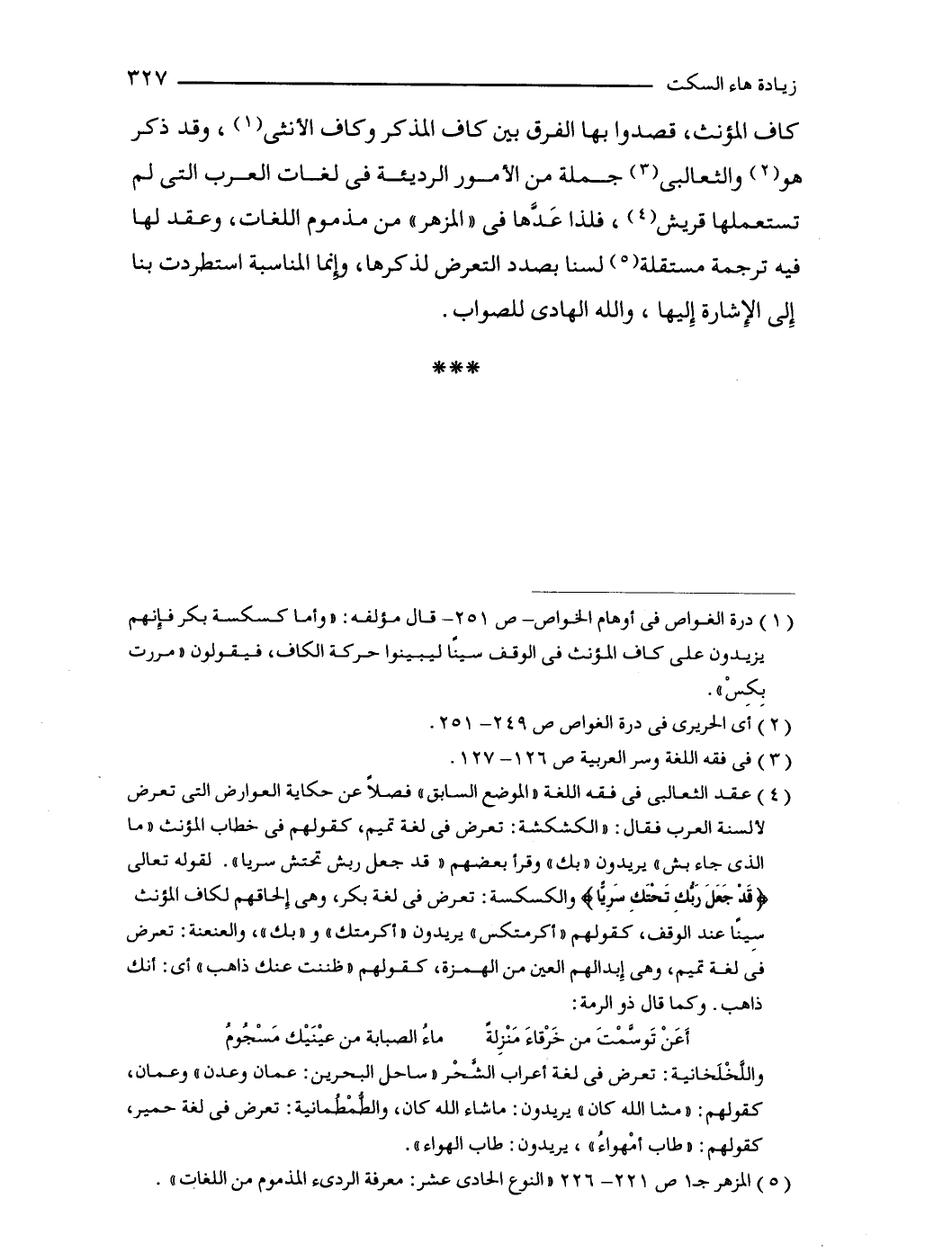 (4) عقد الثعالبي في فقه اللغة "الموضع السابق" فصلًا عن حكاية العوارض التي تعرض لألسنة العرب فقال: "الكشكشة: تعرض في لغة تميم، كقولهم في خطاب المؤنث "ما الذي جاء بش" يريدون "بك" وقرأ بعضهم "قد جعل ربش تحتش سريا". لقوله تعالى {قَدْ جَعَلَ رَبُّكِ تَحْتَكِ سَرِيًّا} والكسكسة: تعرض في لغة بكر، وهي إِلحاقهم لكاف المؤنث سِينًا عند الوقف، كقولهم "أكرمتكس" يريد ون "أكرمتك" و"بك"، والعنعنة: تعرض في لغة تميم، وهي إِبدالهم العين من الهمزة، كقولهم "ظننت عنك ذاهب" أي: أنك ذاهب. وكما قال ذو الرمة: