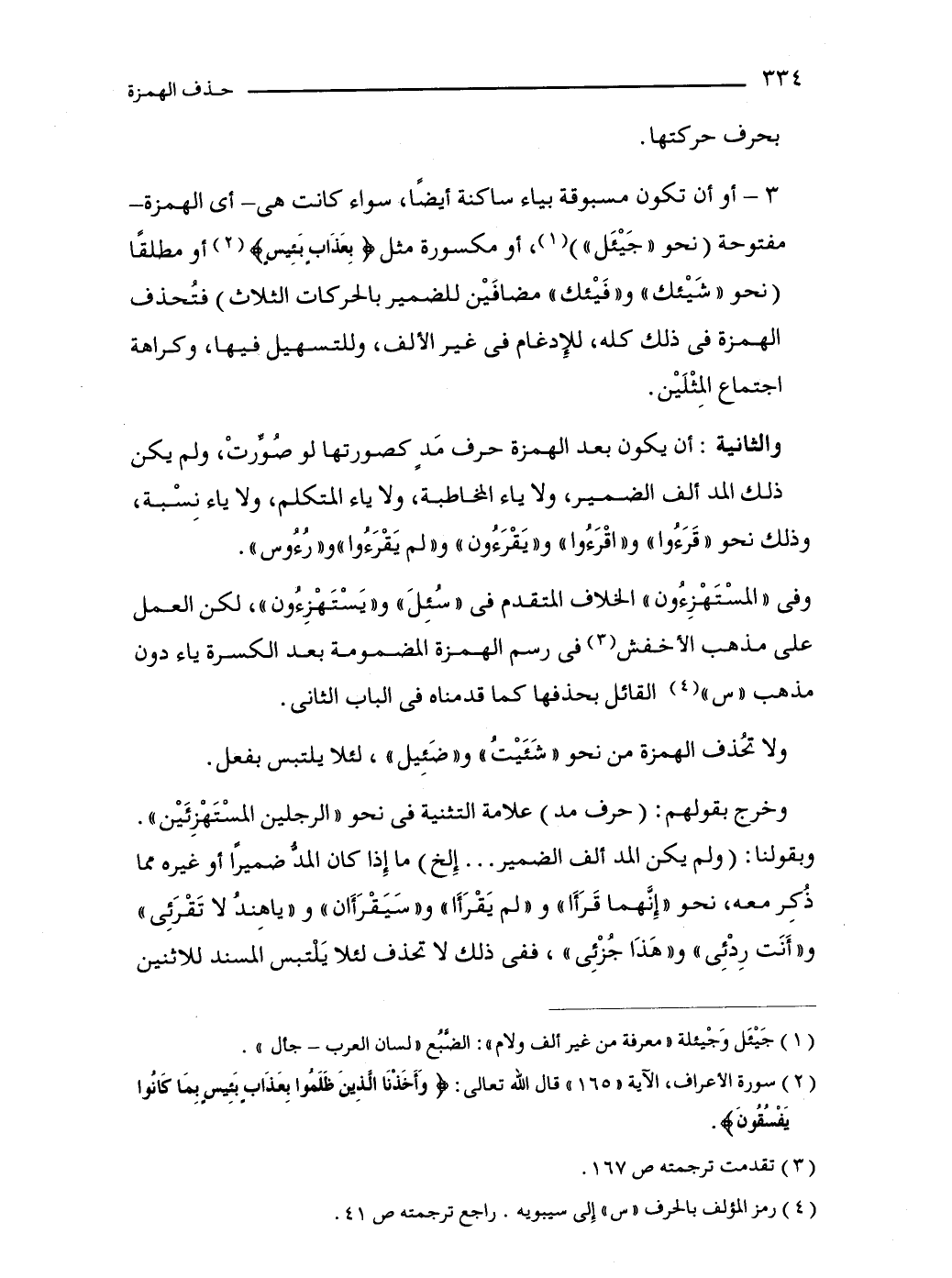 3 - أو أن تكون مسبوقة بياء ساكنة أيضًا، سواء كانت هى -أي الهمزة- مفتوحة (نحو "جَيْئَل") (1)، أو مكسورة مثل {بِعَذَابٍ بَئِيسٍ} (2) أو مطلقًا (نحو "شَيْئك" و"فَيْئك"، مضافَيْن للضمير بالحركات الثلاث) فتُحذف الهمزة في ذلك كله، للإِدغام في غير الألف، وللتسهيل فيها، وكراهة اجتماع المِثْلَيْن.