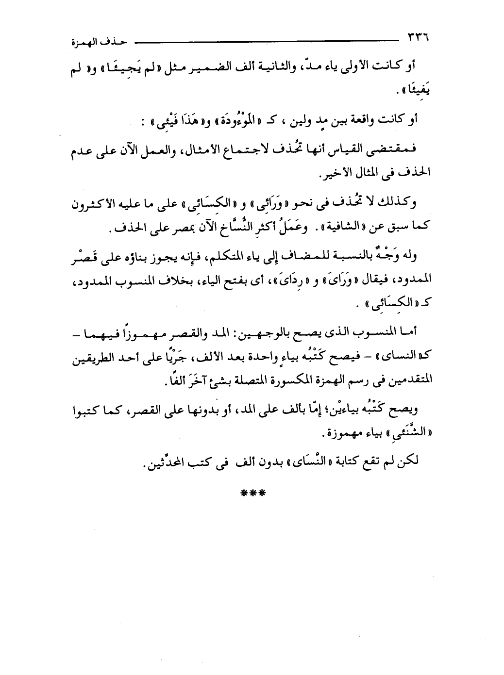 وكذلك لا تُحذف في نحو "وَرَائِى" و"الكِسَائِى" على ما عليه الأكثرون كما سبق عن "الشافية". وعَمَلُ أكثرِ النُّسَّاخ الآن بمصر على الحذف.