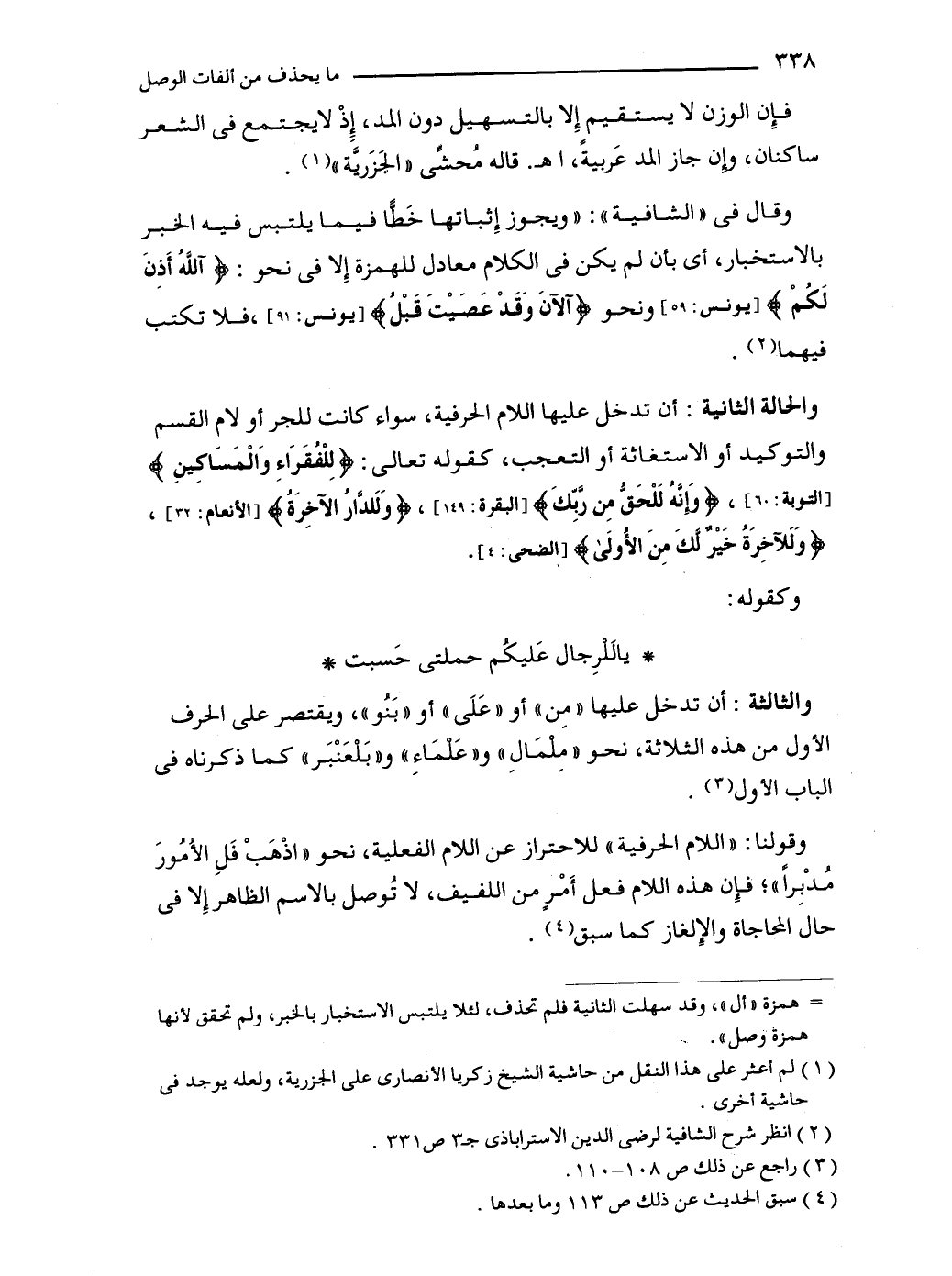 وقال في "الشافية": "ويجوز إِثباتها خَطًّا فيما يلتبس فيه الخبر بالاستخبار، أي بأن لم يكن في الكلام معادل للهمزة إِلا في نحو: {آللَّهُ أَذِنَ لَكُمْ} [يونس: 59] ونحو {آلْآنَ وَقَدْ عَصَيْتَ قَبْلُ} [يونس: 91]، فلا تكتب فيهما (2).