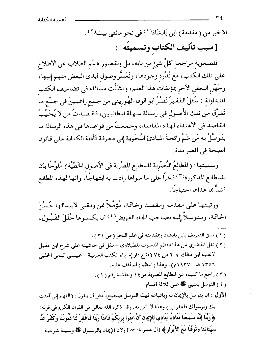 وسميتها: (المطالِعُ النَّصْرِية للمطابِع المِصْرية في الأُصولِ الخَطّيَّة) مُلوِّحًا بأن للمطابع المذكورة (3) فخرًا على ما سواها زادت به ابتهاجًا، وأنها لهذه المطالع أشدُّ مما عداها احتياجًا.