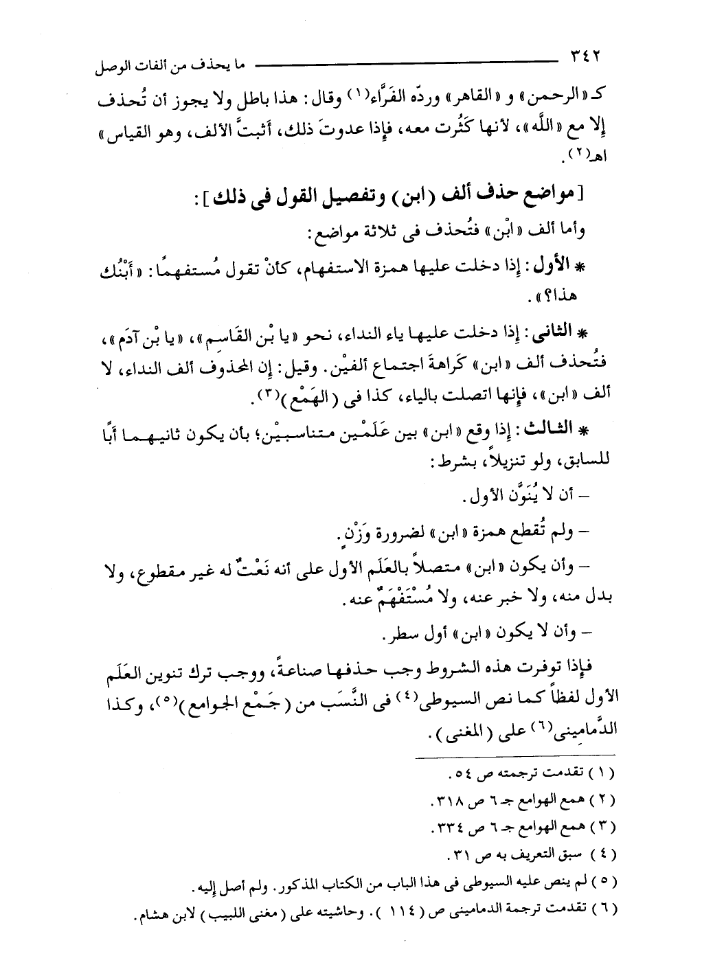 * الثاني: إِذا دخلت عليها ياء النداء، نحو "يا بْن القَاسم"، "يا بْن آدَم"، فتُحذف ألف "ابن" كَراهةَ اجتماع ألفيْن. وقيل: إِن المحذوَف ألف النداء، لا ألف "ابن"، فإِنها اتصلت بالياء، كذا في (الهَمْع) (3).