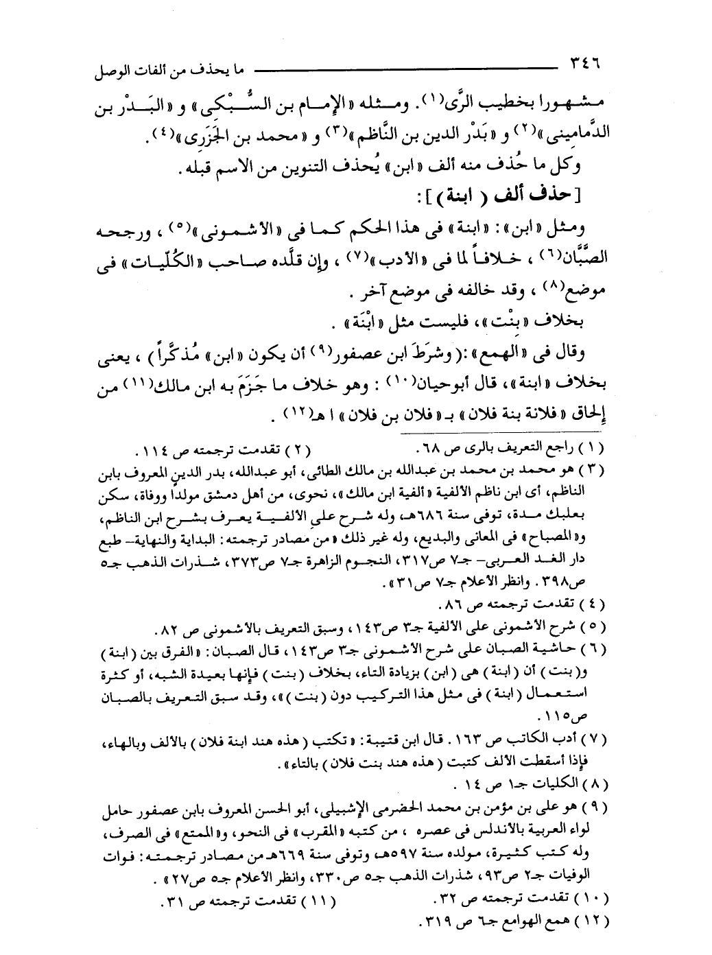 (6) حاشية الصبان على شرح الأشمونى جـ3 ص 143، قال الصبان: "الفرق بين (ابنة) و (بنت) أن (ابنة) هى (ابن) بزيادة التاء، بخلاف (بنت) فإِنها بعيدة الشبه، أو كثرة استعمال (ابنة) في مثل هذا التركيب دون (بنت) "، وقد سبق التعريف بالصبان ص 115.