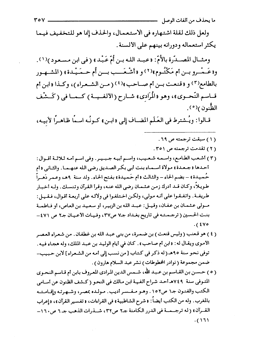 ومثال المصدّرة بالأُمّ: "عبد الله بن أُمّ عَبْد" (في ابن مسعود) (1). و"عَمْرو بن أم مَكْتوم" (2) و"أَشْعَب بن أُم حمَيْدة" (المشهور بالطامع (3) و"قنعت بن أم صاحب" (4) (من الشعراء)، وكذا "ابن أم قاسم النّحوى"، وهو "المُرَادِى" شارح (الألفية) كما في (كَشْف الظُنون) (5).