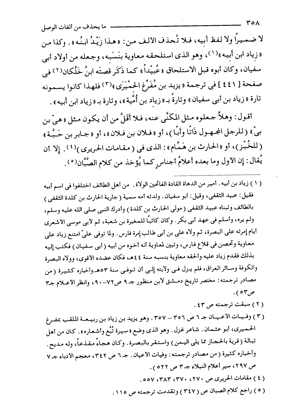 لا ضميرًا ولا لفظ أَبِيه، فلا تُخذف الألف من: "هذا زَيْدُ ابنُه". وكذا من "زِياد ابن أَبِيه" (1)، وهو الذي استلحقه معاوية بنَسَبِه، وجعله من أولاد أبى سفيان، وكان أبوه قبل الاستلحاق "عُبيْدًا" كما ذَكَر قصتَه ابنُ خَلِّكان (2) في صفحة [441] في ترجمة "يزيد بن مُفَرِّغ الحِمْيَرَى" (3) فلهذا كانوا يسمونه تارة "زياد بن أبي سفيان" وتارةً بـ"زياِد بن أُمّية"، وتارة بـ "زياد ابن أَبيه".