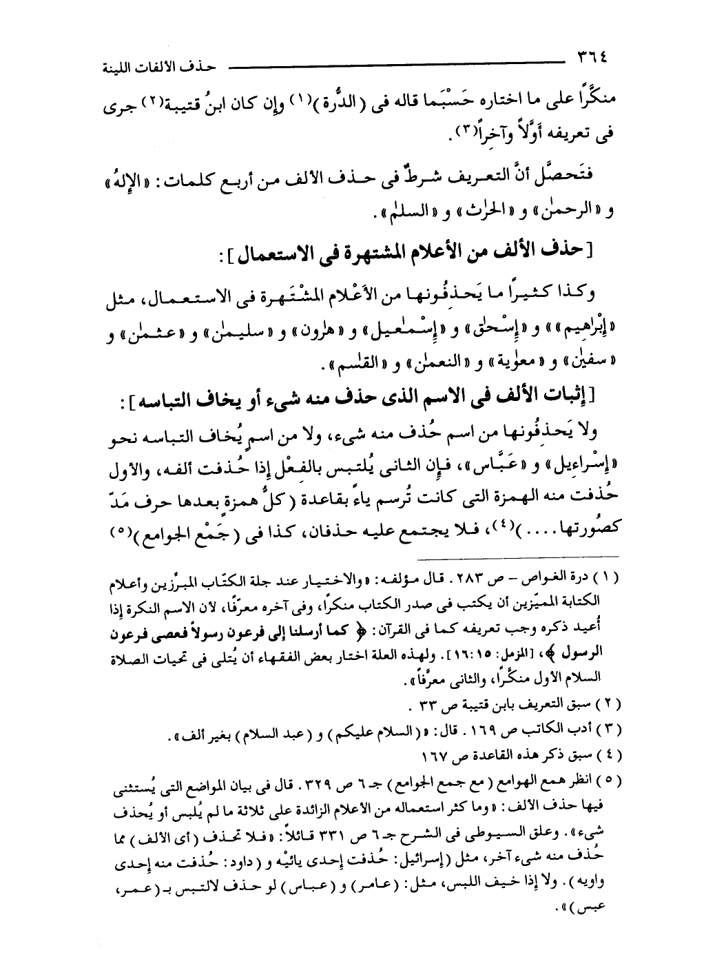 (5) انظر همع الهوامع (مع جمع الجوامع) جـ6 ص 329. قال في بيان المواضع التي يُستثنى فيها حذف الألف: "وما كثر استعماله من الأعلام الزائدة على ثلاثة ما لم يُلبس أو يُحذف شىء". وعلق السيوطي في الشرح جـ 6 ص 331 قائلًا: "فلا تحذف (أي الألف) مما حُذف منه شىءآخر، مثل (إِسرائيل: حُذفت إِحدى يائيْه و (داود: حُذفت منه إِحدى واويه). ولا إِذا خيف اللبس، مثل: (عامر) و (عباس) لو حذف لالتبس بـ (عمر، عبس) ".