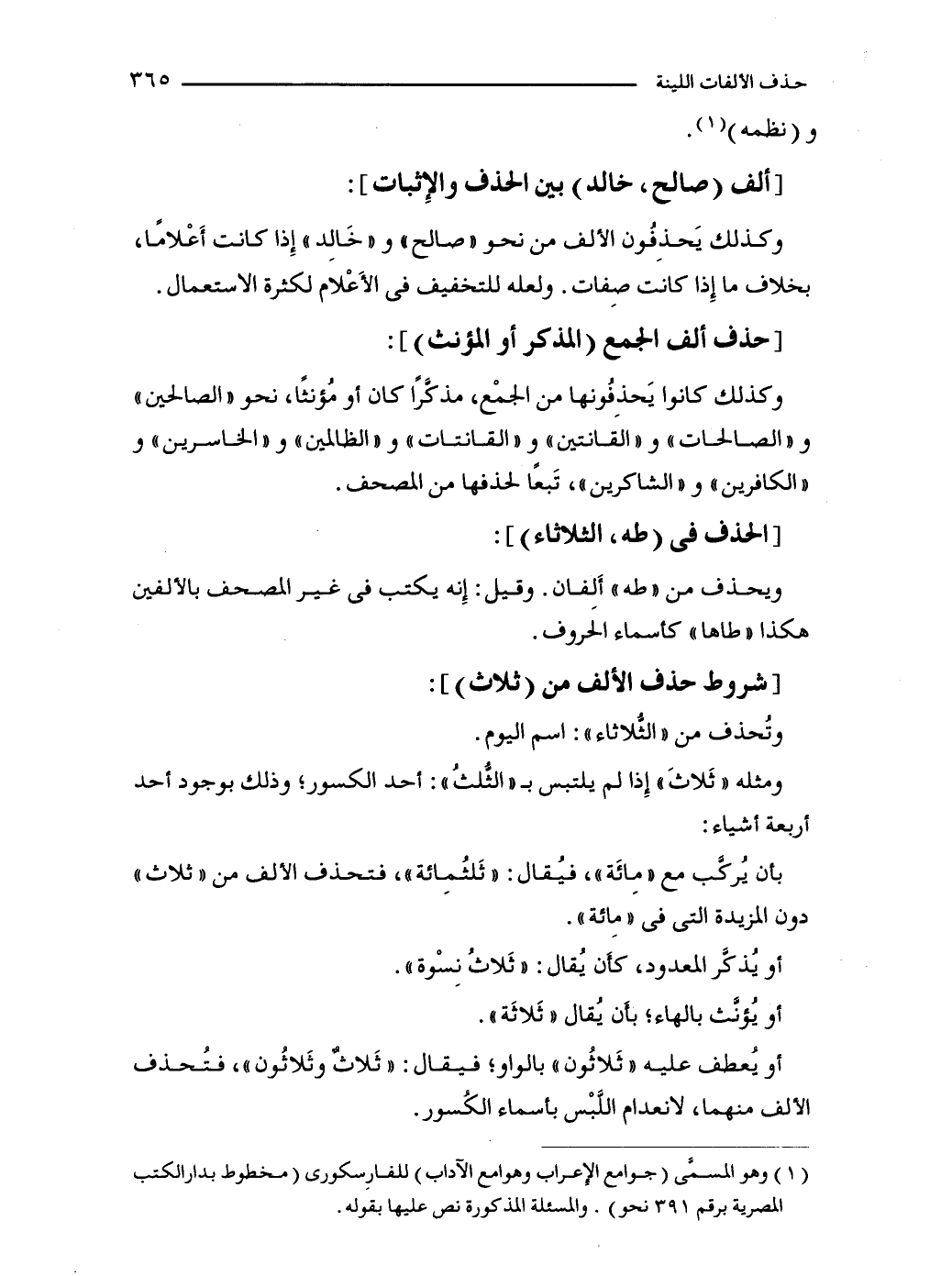 وكذلك كانوا يَحذِفُونها من الجمْع، مذكَّرًا كان أو مُؤنثًا، نحو "الصالحين" و"الصالحات" و"القانتين" و"القانتات" و"الظالمين" و"الخاسرين" و"الكافرين" و"الشاكرين"، تَبعًا لحذفها من المصحف.