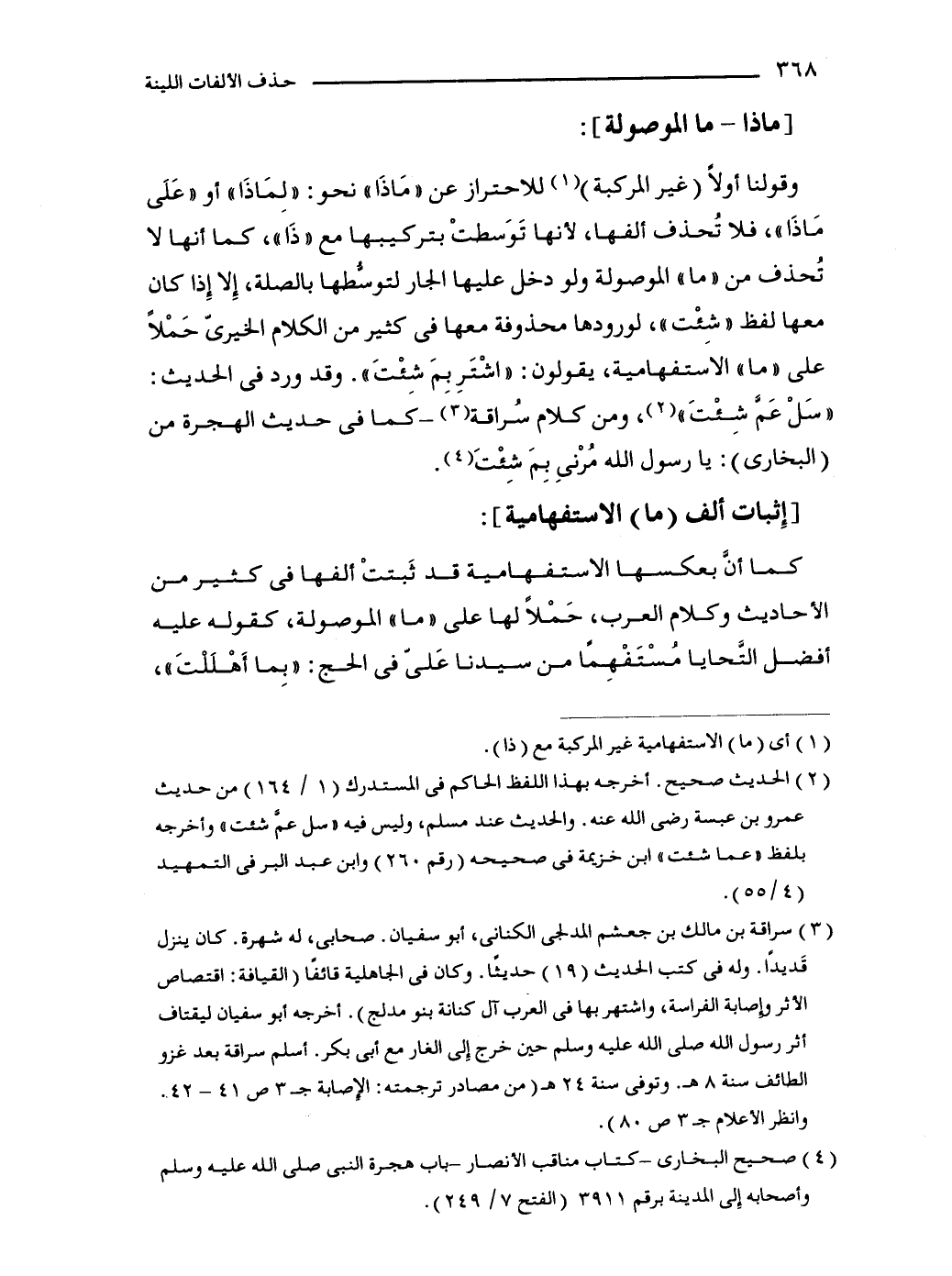 وقولنا أولًا (غير المركبة) (1) للاحتراز عن "مَاذَا" نحو: "لِمَاذَا" أو "عَلَى مَاذَا"، فلا تُحذف ألفها، لأنها تَوَسطتْ بتركيبها مع "ذَا"، كما أنها لا تُحذف من "ما" الموصولة ولو دخل عليها الجار لتوسُّطها بالصلة، إِلا إِذا كان معها لفظ "شِئْت"، لورودها محذوفة معها في كثير من الكلام الخيرىّ حَمْلًا على "ما" الاستفهامية، يقولون: "اشْتَرِ بِمَ شِئْتَ". وقد ورد في الحديث: "سَلْ عَمَّ شِئْتَ" (2)، ومن كلام سُراقة (3) - كما في حديث الهجرة من (البخاري): يا رسول الله مُرْنىِ بِمَ شِئْتَ (4).