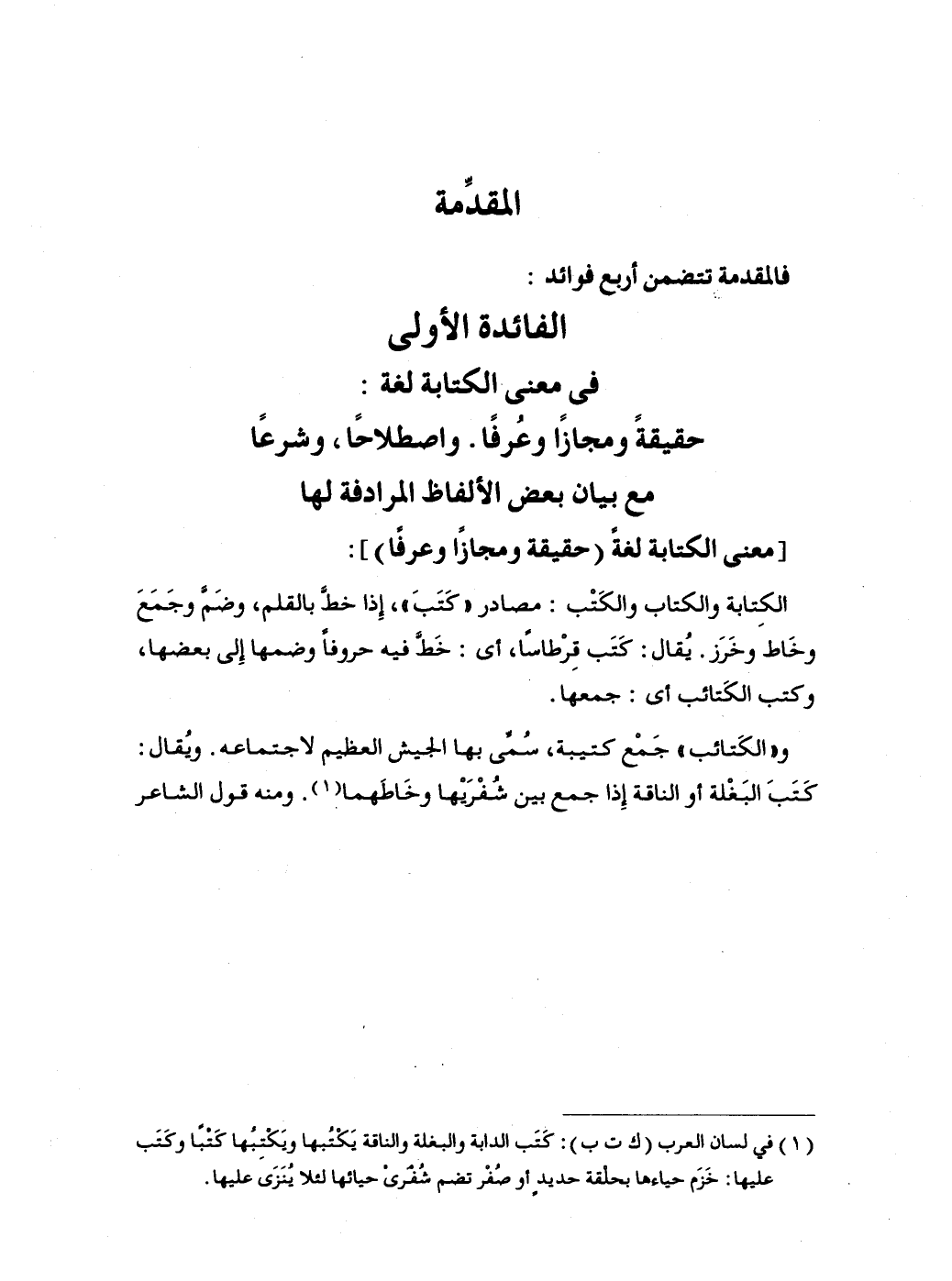 الفائدة الأولى في معنى الكتابة لغة: حقيقةً ومجازًا وعُرفًا. واصطلاحًا، وشرعًا مع بيان بعض الألفاظ المرادفة لها