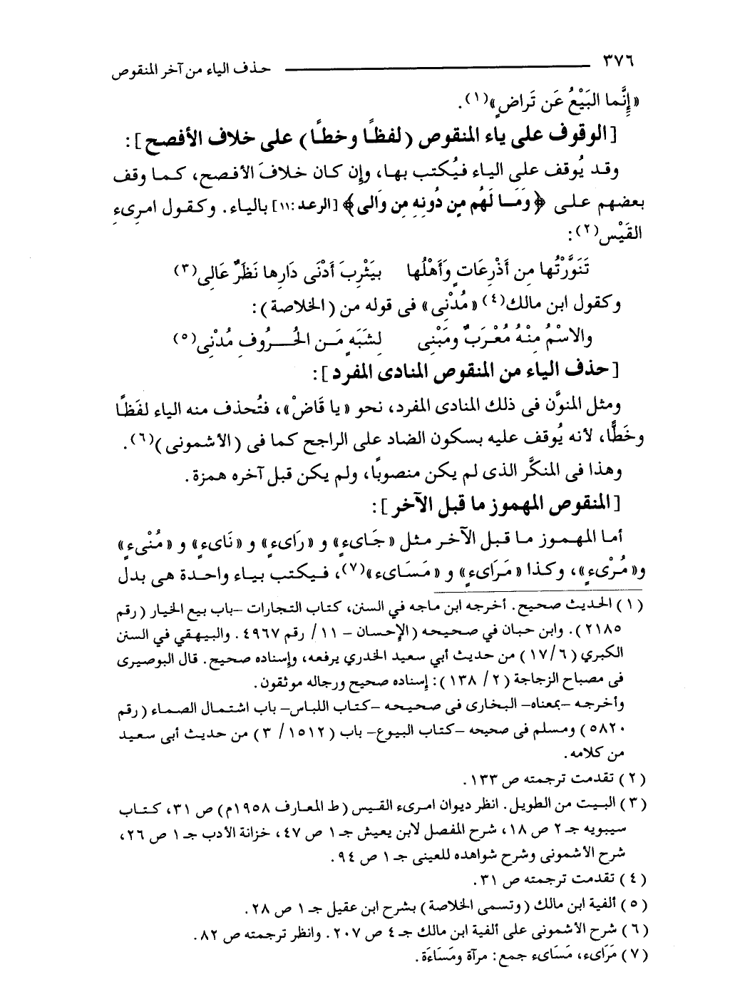 ومثل المنوَّن في ذلك المنادى المفرد، نحو "يا قَاضْ"، فتُحذف منه الياء لفَظًا وخَطًّا، لأنه يُوقف عليه بسكون الضاد على الراجح كما في (الأشمونى) (6).